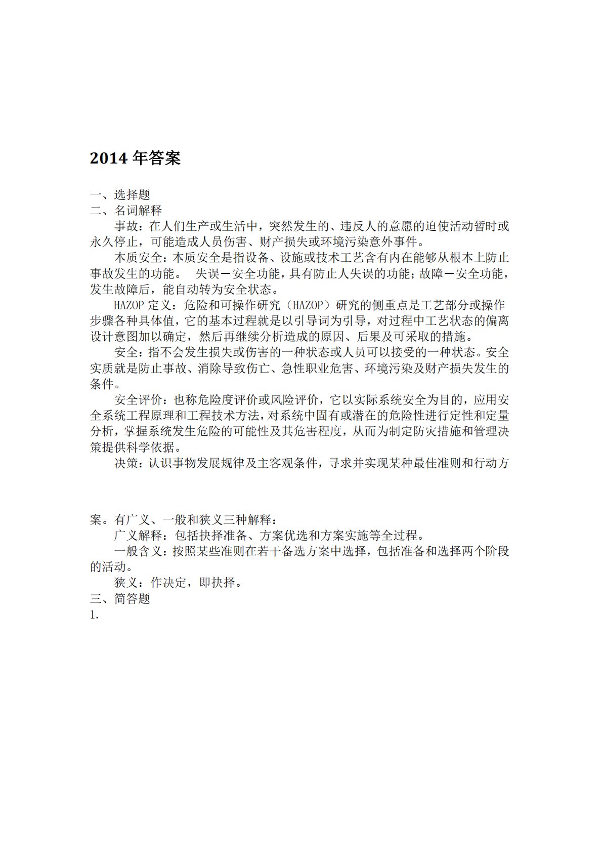 2014年答案一、选择题二、名词解释事故:在人们生产或生活中,突然发生的、违反人的意愿的迫使活动暂时或永久停止,可能造成人员伤害、财产损失或环境污染意外事件。本质安全:本质安全是指设备、设施或技术工艺含有内在能够从根本上防止事故发生的功能。失误-安全功能,具有防止人失误的功能;故障-安全功能,发生故障后,能自动转为安全状态。HAZOP定义:危险和可操作研究(HAZOP)研究的侧重点是工艺部分或操作步骤各种具体值,它的基本过程就是以引导词为引导,对过程中工艺状态的偏离设计意图加以确定,然后再继续分析造成的原因、后果及可采取的措施。安全:指不会发生损失或伤害的一种状态或人员可以接受的一种状态。安全...