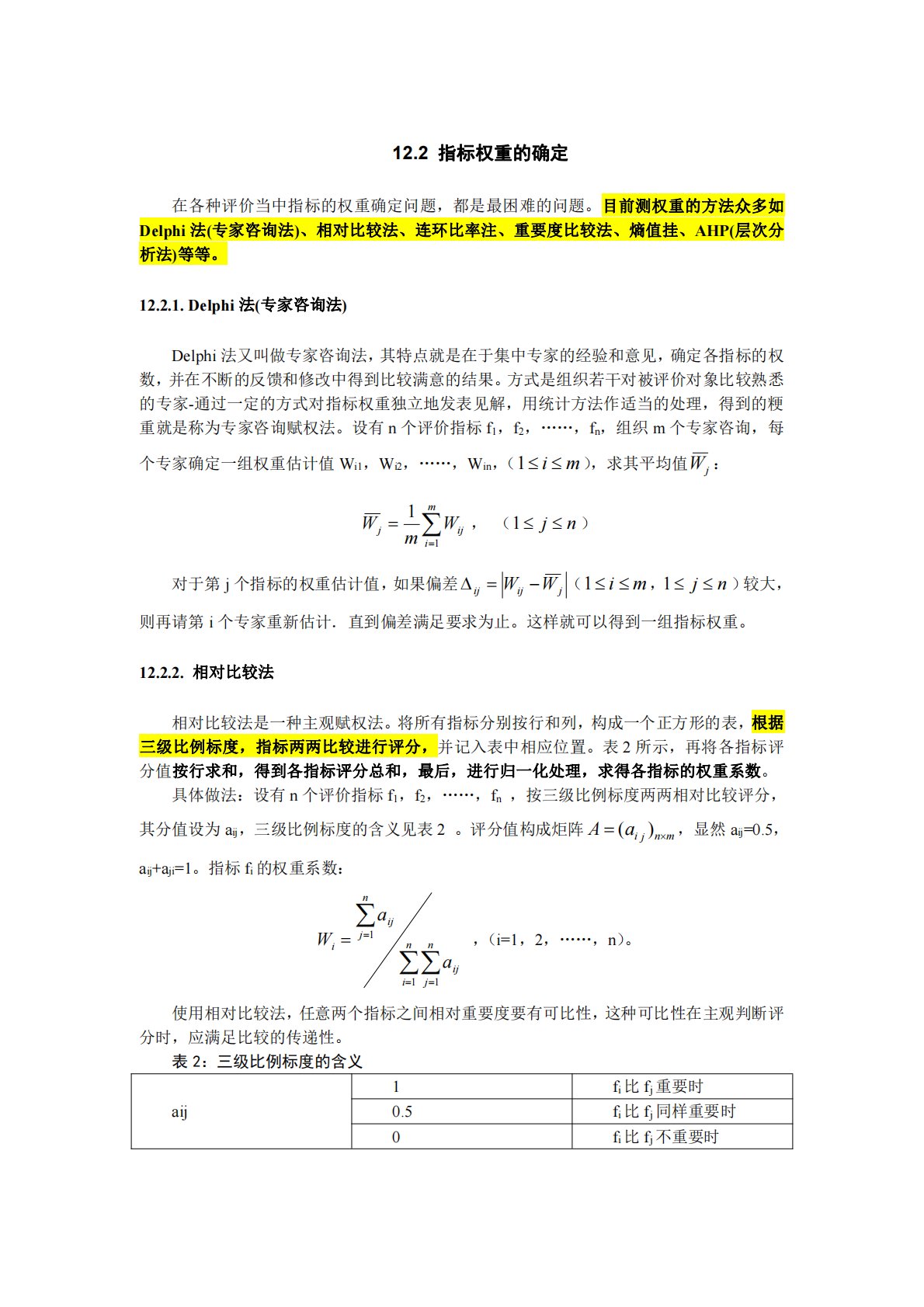 12.2指标权重的确定在各种评价当中指标的权重确定问题,都是最困难的问题。目前测权重的方法众多如Delphi法(专家咨询法)、相对比较法、连环比率注、重要度比较法、熵值挂、AHP(层次分析法)等等。12.2.1.Delphi法(专家咨询法)Delphi法又叫做专家咨询法,其特点就是在于集中专家的经验和意见,确定各指标的权数,并在不断的反馈和修改中得到比较满意的结果。方式是组织若干对被评价对象比较熟悉的专家-通过一定的方式对指标权重独立地发表见解,用统计方法作适当的处理,得到的粳重就是称为专家咨询赋权法。设有n个评价指标f1,f2,……,fn,组织m个专家咨询,每个专家确定一组权重估计值Wi1,...