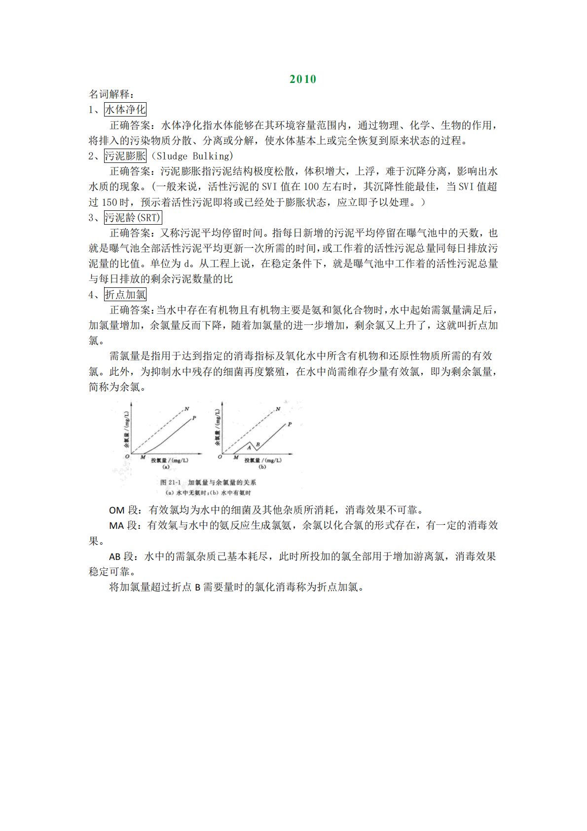 2010名词解释:1、水体净化正确答案:水体净化指水体能够在其环境容量范围内,通过物理、化学、生物的作用,将排入的污染物质分散、分离或分解,使水体基本上或完全恢复到原来状态的过程。2、污泥膨胀(SludgeBulking)正确答案:污泥膨胀指污泥结构极度松散,体积增大,上浮,难于沉降分离,影响出水水质的现象。(一般来说,活性污泥的SVI值在100左右时,其沉降性能最佳,当SVI值超过150时,预示着活性污泥即将或已经处于膨胀状态,应立即予以处理。)3、污泥龄(SRT)正确答案:又称污泥平均停留时间。指每日新增的污泥平均停留在曝气池中的天数,也就是曝气池全部活性污泥平均更新一次所需的时间,或工作...