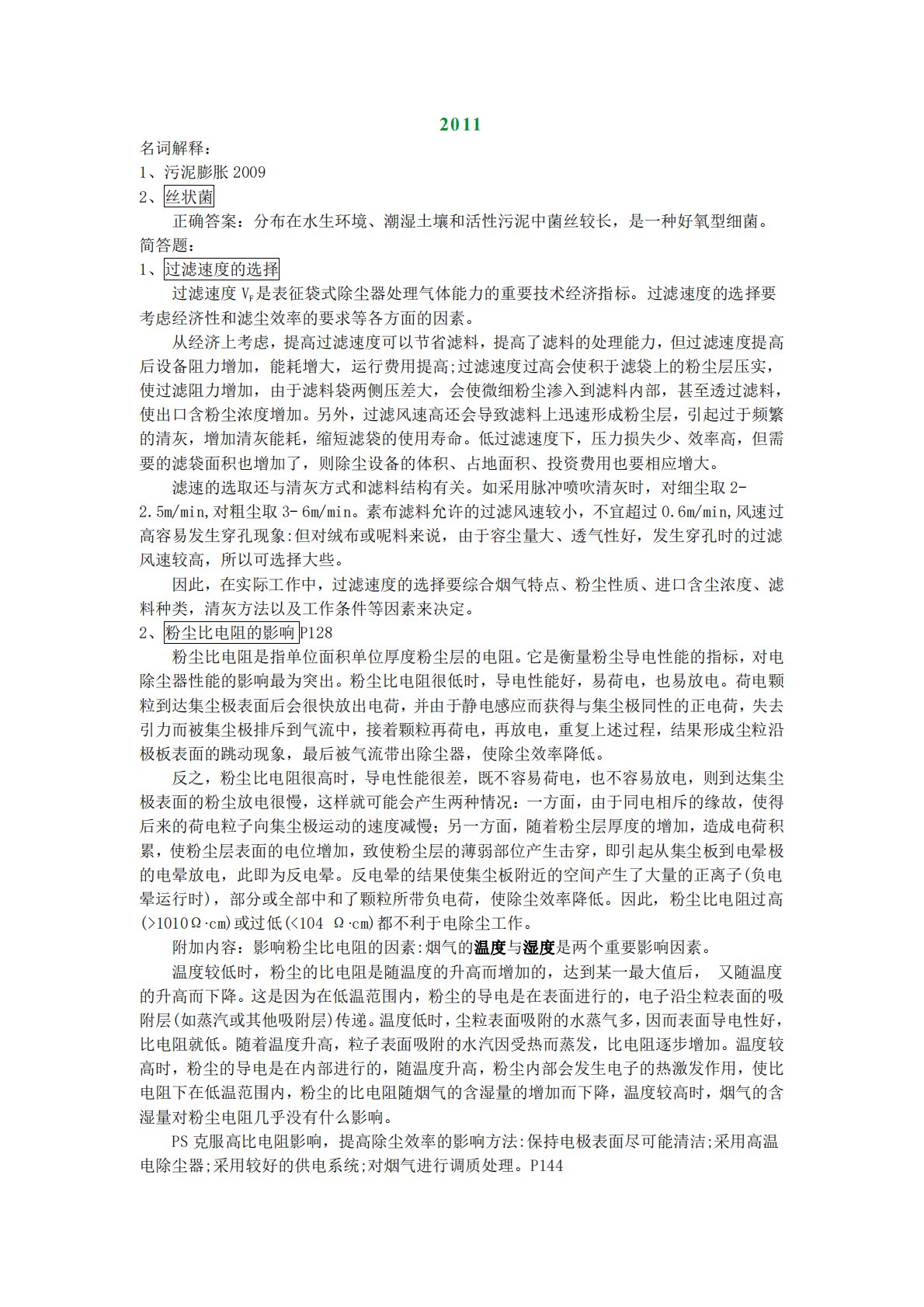 2011名词解释:1、污泥膨胀20092、丝状菌正确答案:分布在水生环境、潮湿土壤和活性污泥中菌丝较长,是一种好氧型细菌。简答题:1、过滤速度的选择过滤速度VF是表征袋式除尘器处理气体能力的重要技术经济指标。过滤速度的选择要考虑经济性和滤尘效率的要求等各方面的因素。从经济上考虑,提高过滤速度可以节省滤料,提高了滤料的处理能力,但过滤速度提高后设备阻力增加,能耗增大,运行费用提高;过滤速度过高会使积于滤袋上的粉尘层压实,使过滤阻力增加,由于滤料袋两侧压差大,会使微细粉尘渗入到滤料内部,甚至透过滤料,使出口含粉尘浓度增加。另外,过滤风速高还会导致滤料上迅速形成粉尘层,引起过于频繁的清灰,增加清灰能...