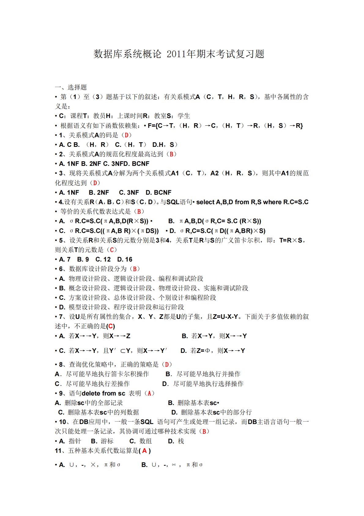 数据库系统概论2011年期末考试复习题一、选择题•第(1)至(3)题基于以下的叙述:有关系模式A(C,T,H,R,S),基中各属性的含义是:•C:课程T:教员H:上课时间R:教室S:学生•根据语义有如下函数依赖集:•F={C→T,(H,R)→C,(H,T)→R,(H,S)→R}•1、关系模式A的码是(D)•A.CB.(H,R)C.(H,T)D.H,S)•2、关系模式A的规范化程度最高达到(B)•A.1NFB.2NFC.3NFD.BCNF•3、现将关系模式A分解为两个关系模式A1(C,T),A2(H,R,S),则其中A1的规范化程度达到(D)•A.1NFB.2NFC.3NFD.BCNF•4.设有...