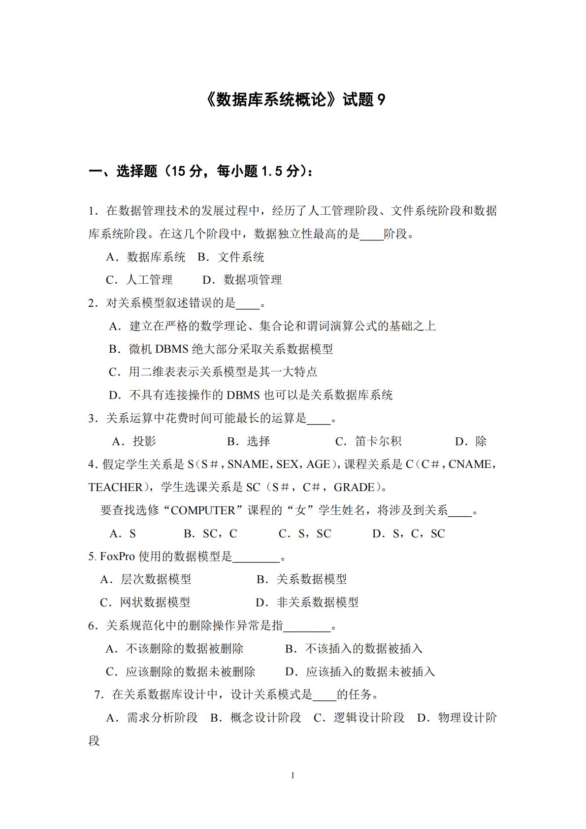 1《数据库系统概论》试题9一、选择题(15分,每小题1.5分):1.在数据管理技术的发展过程中,经历了人工管理阶段、文件系统阶段和数据库系统阶段。在这几个阶段中,数据独立性最高的是____阶段。A.数据库系统B.文件系统C.人工管理D.数据项管理2.对关系模型叙述错误的是____。A.建立在严格的数学理论、集合论和谓词演算公式的基础之上B.微机DBMS绝大部分采取关系数据模型C.用二维表表示关系模型是其一大特点D.不具有连接操作的DBMS也可以是关系数据库系统3.关系运算中花费时间可能最长的运算是____。A.投影B.选择C.笛卡尔积D.除4.假定学生关系是S(S#,SNAME,SEX,AGE...