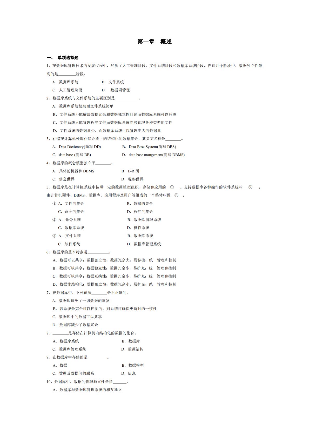 第一章概述一、单项选择题1、在数据库管理技术的发展过程中,经历了人工管理阶段、文件系统阶段和数据库系统阶段。在这几个阶段中,数据独立性最高的是阶段。A.数据库系统B.文件系统C.人工管理阶段D.数据项管理2、数据库系统与文件系统的主要区别是。A.数据库系统复杂而文件系统简单B.文件系统不能解决数据冗余和数据独立性问题而数据库系统可以解决C.文件系统只能管理程序文件而数据库系统能够管理各种类型的文件D.文件系统的数据量少,而数据库系统可以管理庞大的数据量3、存储在计算机外部存储介质上的结构化的数据集合,其英文名称是。A.DataDictionary(简写DD)B.DataBaseSystem(简...