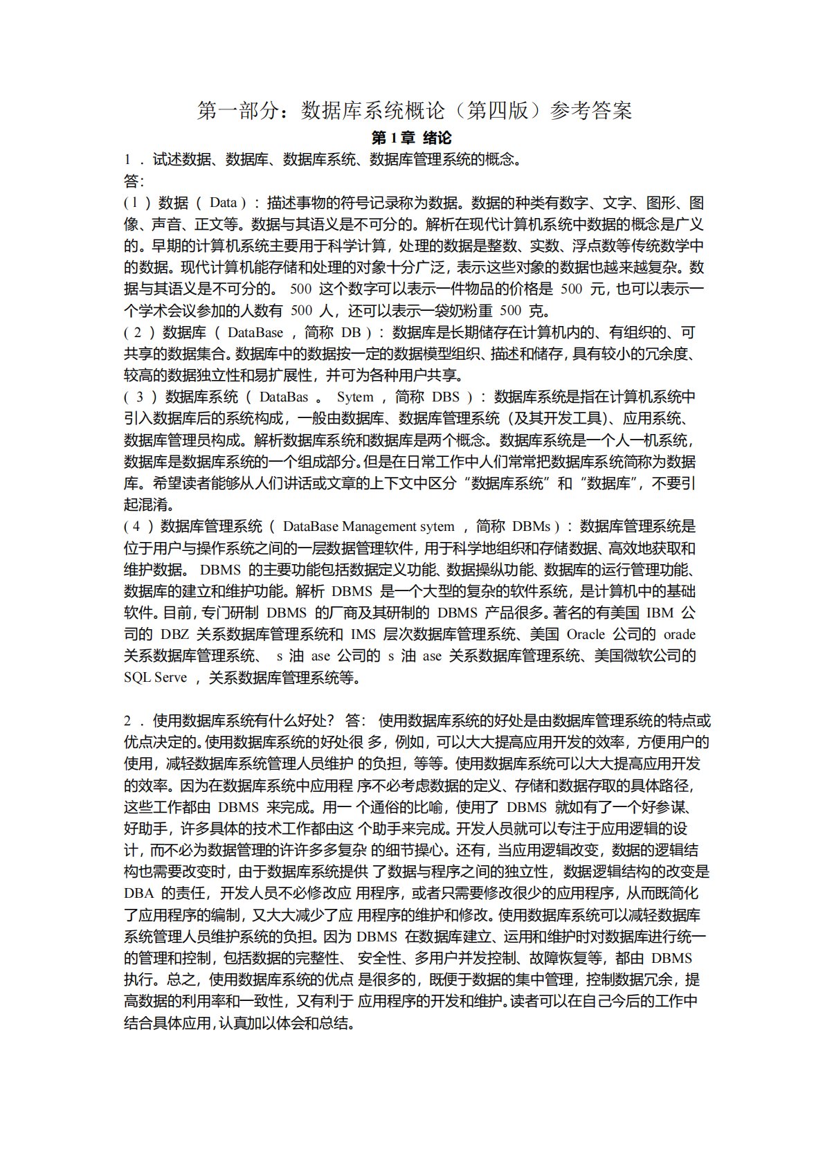第一部分:数据库系统概论(第四版)参考答案第1章绪论1.试述数据、数据库、数据库系统、数据库管理系统的概念。答:(l)数据(Data):描述事物的符号记录称为数据。数据的种类有数字、文字、图形、图像、声音、正文等。数据与其语义是不可分的。解析在现代计算机系统中数据的概念是广义的。早期的计算机系统主要用于科学计算,处理的数据是整数、实数、浮点数等传统数学中的数据。现代计算机能存储和处理的对象十分广泛,表示这些对象的数据也越来越复杂。数据与其语义是不可分的。500这个数字可以表示一件物品的价格是500元,也可以表示一个学术会议参加的人数有500人,还可以表示一袋奶粉重500克。(2)数据库(Dat...