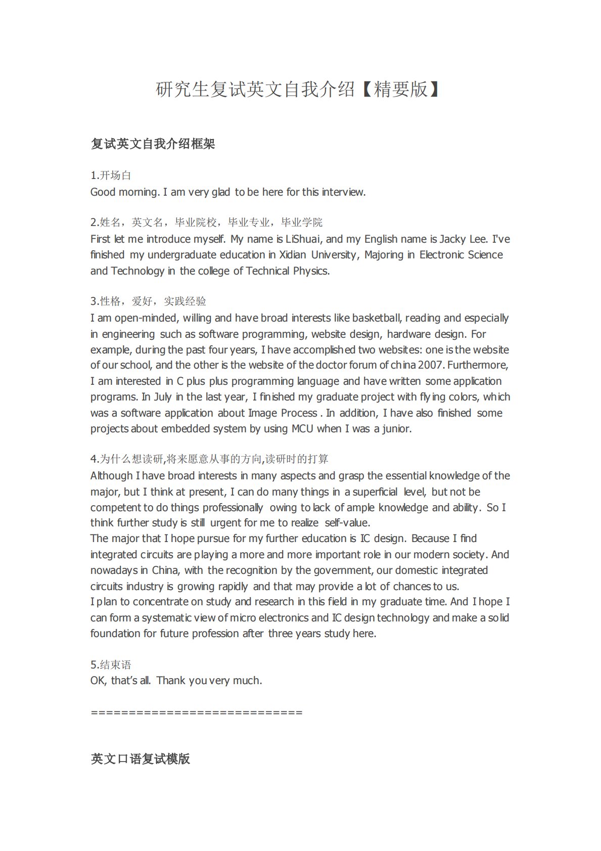 研究生复试英文自我介绍【精要版】复试英文自我介绍框架1.开场白Goodmorning.Iamverygladtobehereforthisinterview.2.姓名,英文名,毕业院校,毕业专业,毕业学院Firstletmeintroducemyself.MynameisLiShuai,andmyEnglishnameisJackyLee.I'vefinishedmyundergraduateeducationinXidianUniversity,MajoringinElectronicScienceandTechnologyinthecollegeofTechnicalPhysics.3.性...