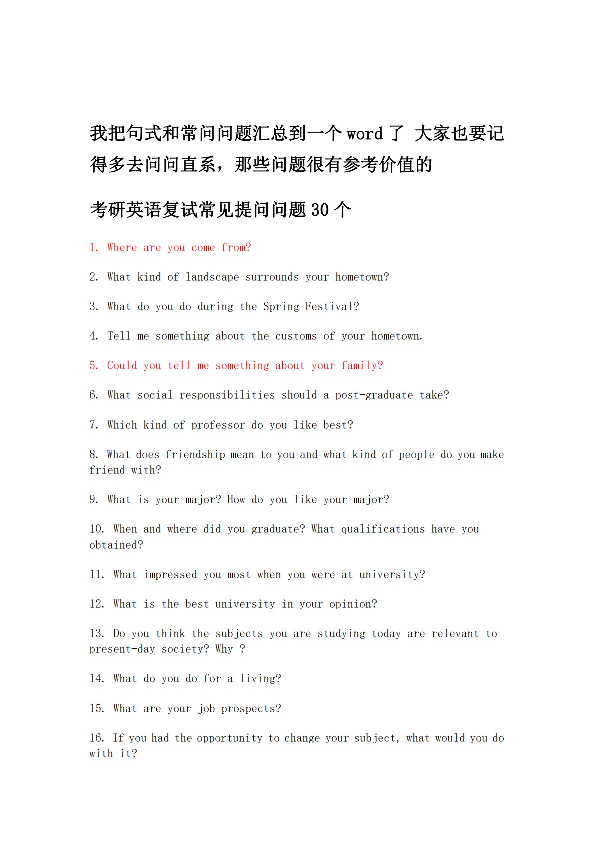 我把句式和常问问题汇总到一个word了大家也要记得多去问问直系,那些问题很有参考价值的考研英语复试常见提问问题30个1.Whereareyoucomefrom?2.Whatkindoflandscapesurroundsyourhometown?3.WhatdoyoudoduringtheSpringFestival?4.Tellmesomethingaboutthecustomsofyourhometown.5.Couldyoutellmesomethingaboutyourfamily?6.Whatsocialresponsibilitiesshouldapost-graduatetake...