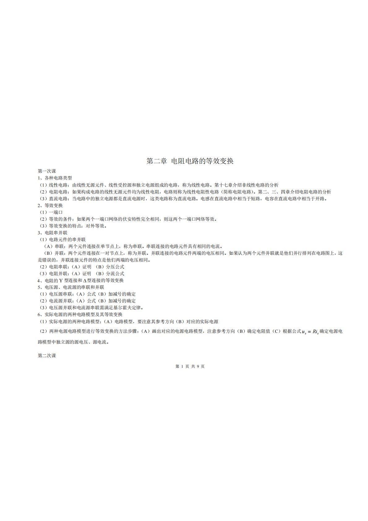 第1页共9页第二章电阻电路的等效变换第一次课1、各种电路类型(1)线性电路:由线性无源元件、线性受控源和独立电源组成的电路,称为线性电路。第十七章介绍非线性电路的分析(2)电阻电路:如果构成电路的线性无源元件均为线性电阻,电路则称为线性电阻性电路(简称电阻电路)。第二、三、四章介绍电阻电路的分析(3)直流电路:当电路中的独立电源都是直流电源时,这类电路称为直流电路。电感在直流电路中相当于短路,电容在直流电路中相当于开路。2、等效变换(1)一端口(2)等效的条件:如果两个一端口网络的伏安特性完全相同,则这两个一端口网络等效。(3)等效变换的特点:对外等效。3、电阻串并联(1)电路元件的串并联(A...