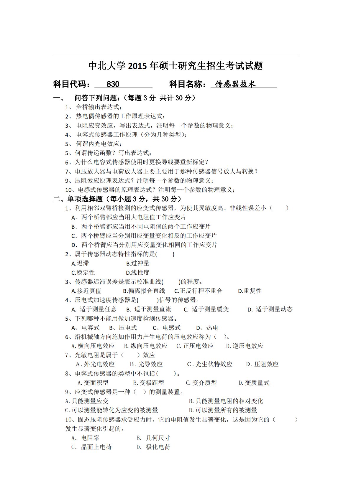 中北大学810传感器技术2015年真题1