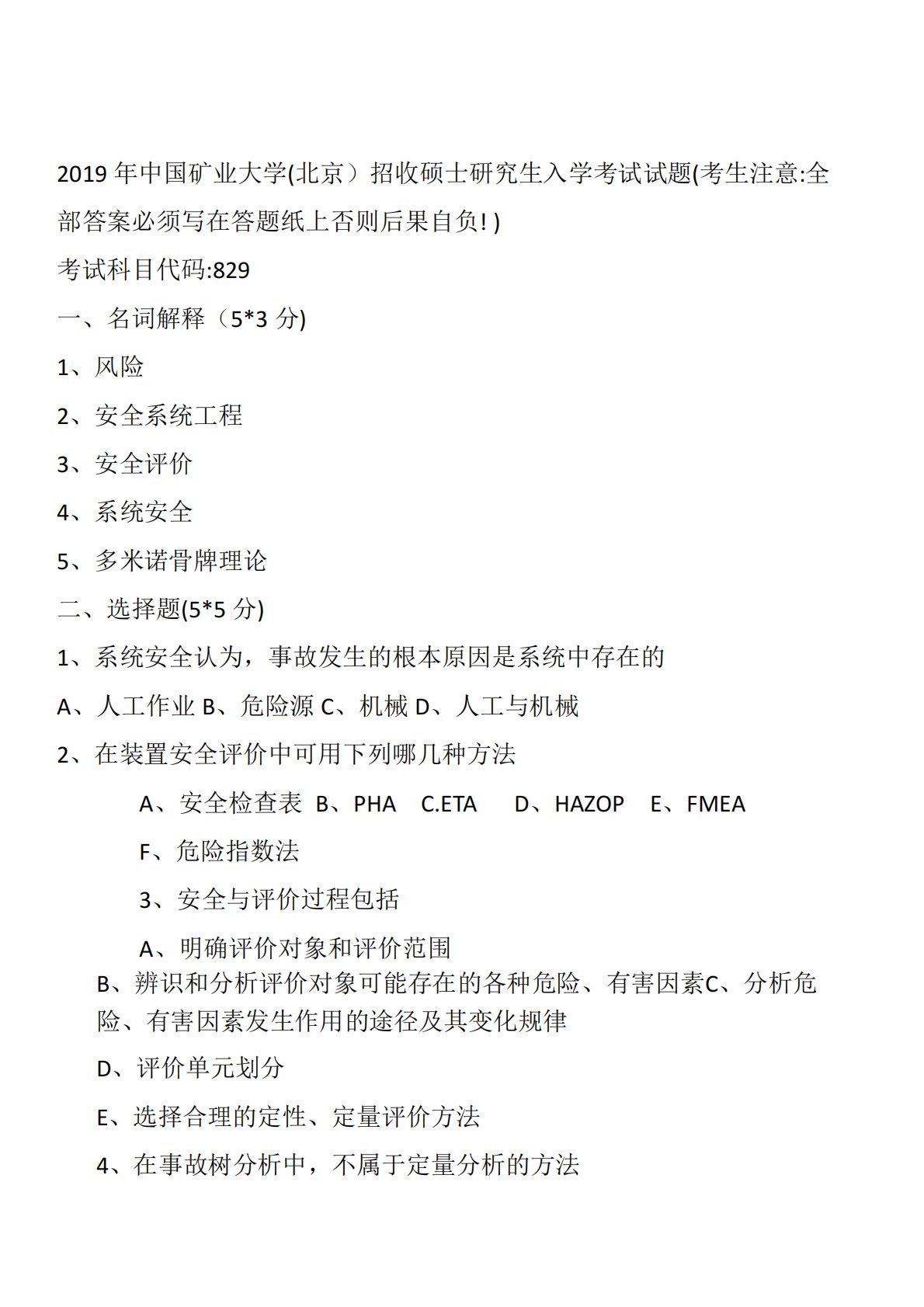 B、辨识和分析评价对象可能存在的各种危险、有害因素C、分析危险、有害因素发生作用的途径及其变化规律D、评价单元划分E、选择合理的定性、定量评价方法4D、HAZOPE、2019年中国矿业大学(北京)招收硕士研究生入学考试试题(考生注意:全部答案必须写在答题纸上否则后果自负!)考试科目代码:829一、名词解释(5*3分)1、风险2、安全系统工程3、安全评价4、系统安全5、多米诺骨牌理论二、选择题(5*5分)1、系统安全认为,事故发生的根本原因是系统中存在的A、人工作业B、危险源C、机械D、人工与机械2、在装置安全评价中可用下列哪几种方法FMEAA、安全检查表B、PHAC.ETAF、危险指数法3、安...