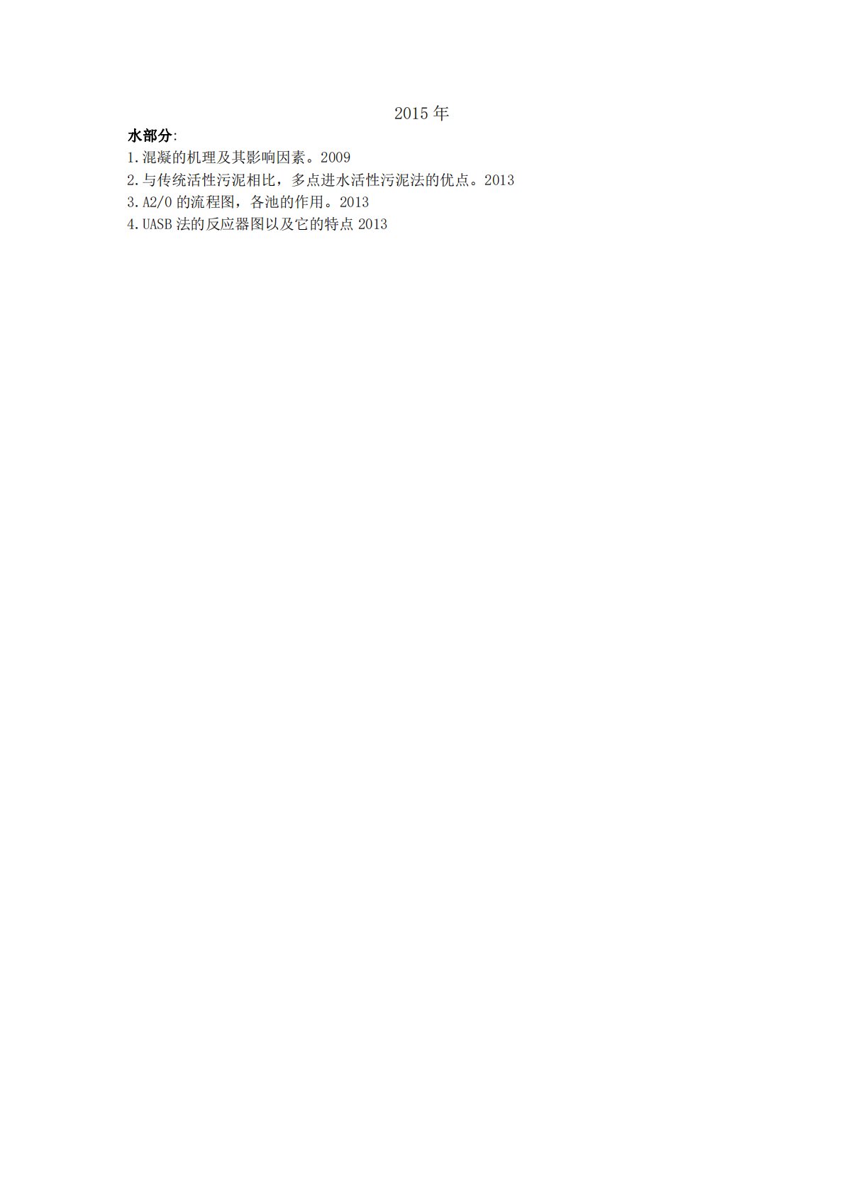 2015年水部分:1.混凝的机理及其影响因素。20092.与传统活性污泥相比,多点进水活性污泥法的优点。20133.A2/0的流程图,各池的作用。20134.UASB法的反应器图以及它的特点20132015年水部分:1.混凝的机理及其影响因素。20092.与传统活性污泥相比,多点进水活性污泥法的优点。20133.A2/0的流程图,各池的作用。20134.UASB法的反应器图以及它的特点20135.厌氧生物处理过程及其影响因素2009大气部分:1.净化除尘系统及其过程包括哪些?画出一个最基本的负压除尘系统,分析负压除尘系统的特点。20132.粉尘比电阻大小的影响。20113.城市热岛效应2011...