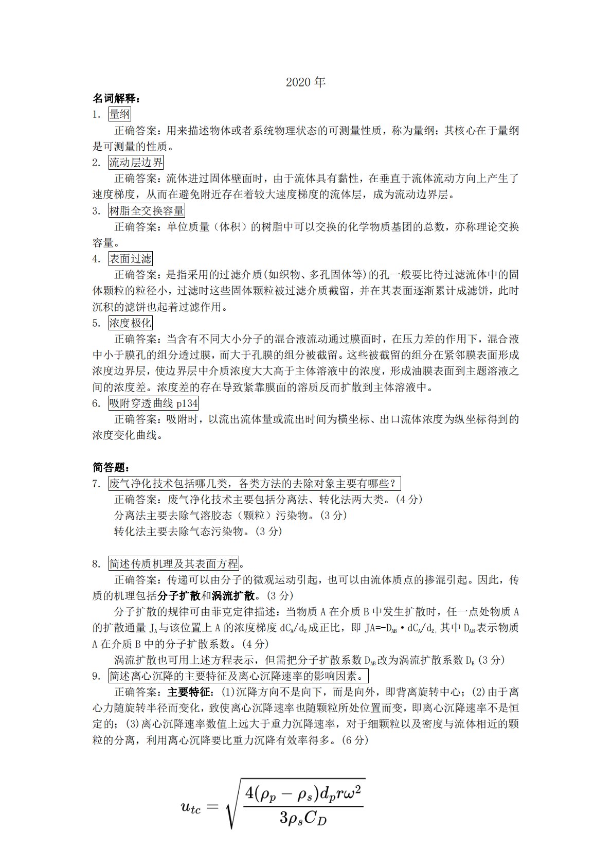 2020年名词解释:1.量纲正确答案:用来描述物体或者系统物理状态的可测量性质,称为量纲;其核心在于量纲是可测量的性质。2.流动层边界正确答案:流体进过固体壁面时,由于流体具有黏性,在垂直于流体流动方向上产生了速度梯度,从而在避免附近存在着较大速度梯度的流体层,成为流动边界层。3.树脂全交换容量正确答案:单位质量(体积)的树脂中可以交换的化学物质基团的总数,亦称理论交换容量。4.表面过滤正确答案:是指采用的过滤介质(如织物、多孔固体等)的孔一般要比待过滤流体中的固体颗粒的粒径小,过滤时这些固体颗粒被过滤介质截留,并在其表面逐渐累计成滤饼,此时沉积的滤饼也起着过滤作用。5.浓度极化正确答案:当含...