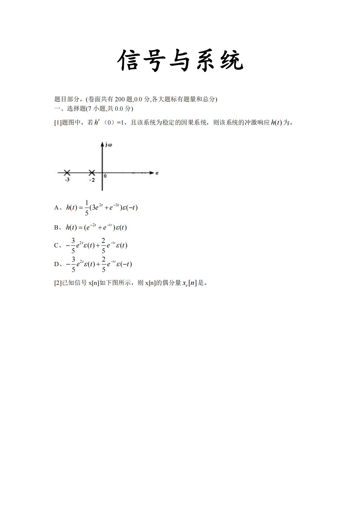 信号与系统题目部分,(卷面共有200题,0.0分,各大题标有题量和总分)一、选择题(7小题,共0.0分)[1]题图中,若h(0)=1,且该系统为稳定的因果系统,则该系统的冲激响应()ht为。A、231()(3)()5tthteetB、32()()()tthteetC、3232()()55ttetetD、3232()()55ttetet[2]已知信号x[n]如下图所示,则x[n]的偶分量[]exn是。[3]波形如图示,通过一截止角频率为50rads,通带内传输值为1,相移为零的理想低通滤波器,则输出的频率分量为()A、012cos20cos40CCt...