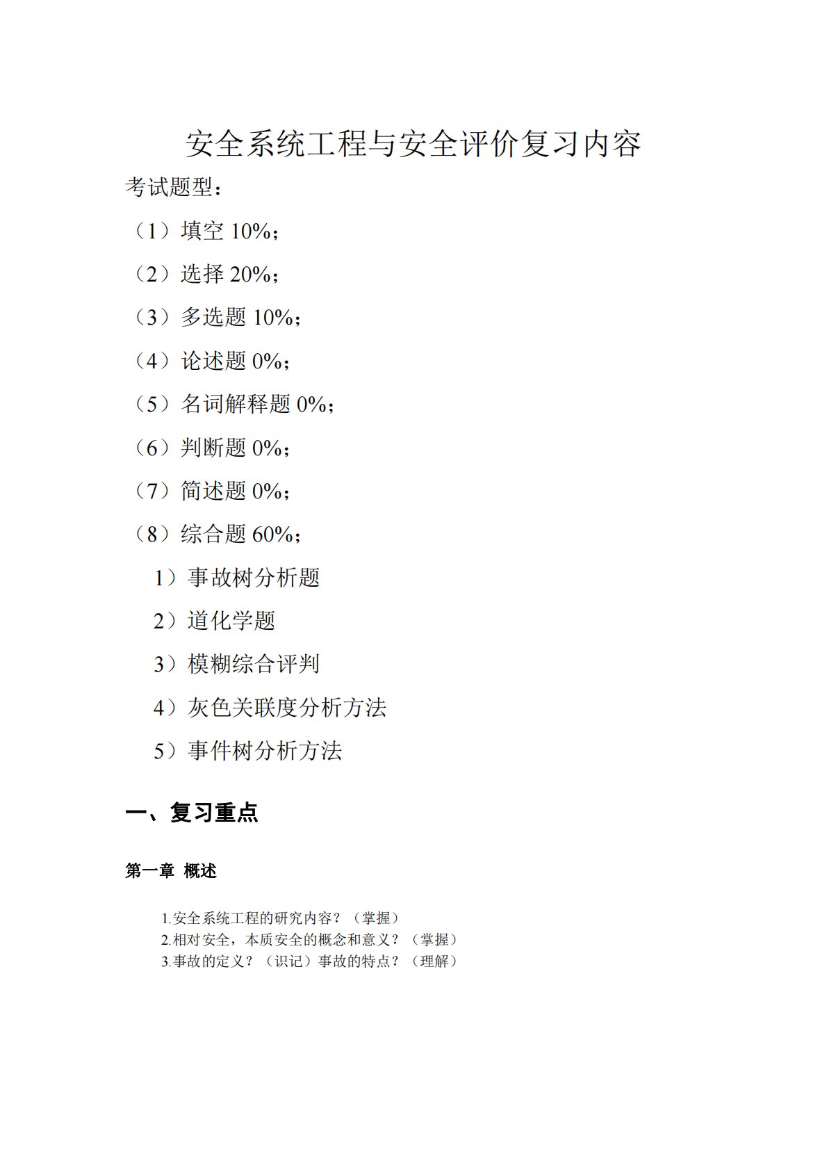 安全系统工程与安全评价复习内容考试题型:(1)填空10%;(2)选择20%;(3)多选题10%;(4)论述题0%;(5)名词解释题0%;(6)判断题0%;(7)简述题0%;(8)综合题60%;1)事故树分析题2)道化学题3)模糊综合评判4)灰色关联度分析方法5)事件树分析方法一、复习重点第一章概述1.安全系统工程的研究内容?(掌握)2.相对安全,本质安全的概念和意义?(掌握)3.事故的定义?(识记)事故的特点?(理解)第二章事故致因理论1.事故致因理论事故致因理论即事故模式对于人们认识事故本质,指导事故调查、事故分析、事故预防及事故责任者的处理有重要作用。2.事故因果论类型3.多米诺骨牌理论及...