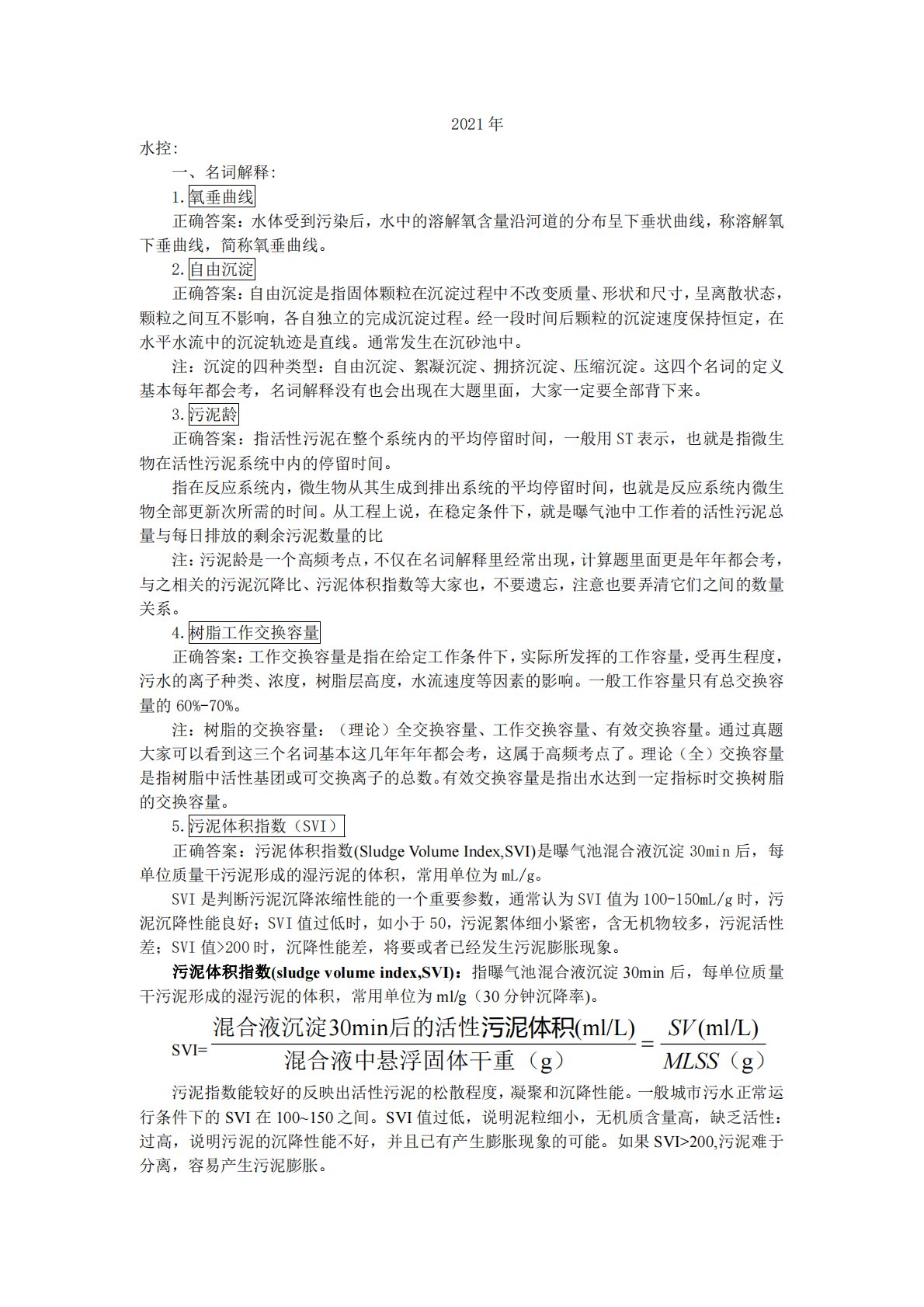 2021年水控:一、名词解释:1.氧垂曲线正确答案:水体受到污染后,水中的溶解氧含量沿河道的分布呈下垂状曲线,称溶解氧下垂曲线,简称氧垂曲线。2.自由沉淀正确答案:自由沉淀是指固体颗粒在沉淀过程中不改变质量、形状和尺寸,呈离散状态,颗粒之间互不影响,各自独立的完成沉淀过程。经一段时间后颗粒的沉淀速度保持恒定,在水平水流中的沉淀轨迹是直线。通常发生在沉砂池中。注:沉淀的四种类型:自由沉淀、絮凝沉淀、拥挤沉淀、压缩沉淀。这四个名词的定义基本每年都会考,名词解释没有也会出现在大题里面,大家一定要全部背下来。3.污泥龄正确答案:指活性污泥在整个系统内的平均停留时间,一般用ST表示,也就是指微生物在活性...