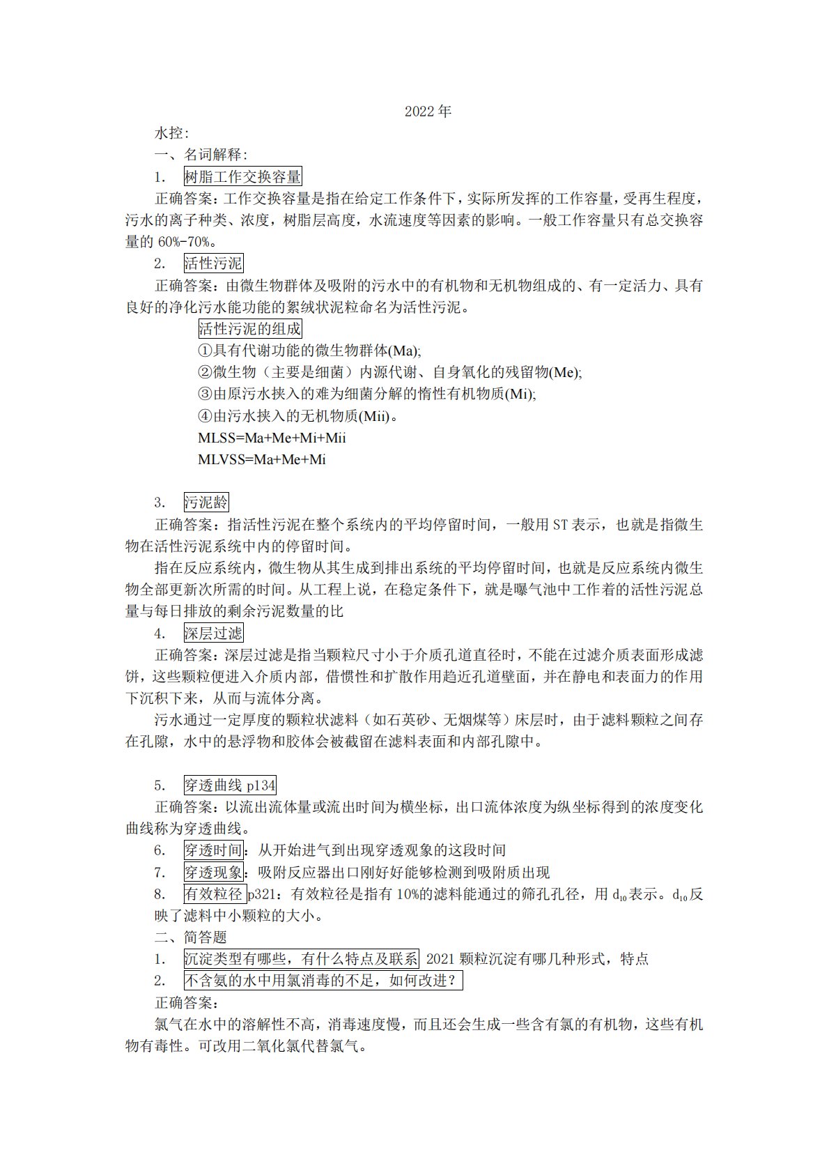 2022年水控:一、名词解释:1.树脂工作交换容量正确答案:工作交换容量是指在给定工作条件下,实际所发挥的工作容量,受再生程度,污水的离子种类、浓度,树脂层高度,水流速度等因素的影响。一般工作容量只有总交换容量的60%-70%。2.活性污泥正确答案:由微生物群体及吸附的污水中的有机物和无机物组成的、有一定活力、具有良好的净化污水能功能的絮绒状泥粒命名为活性污泥。活性污泥的组成①具有代谢功能的微生物群体(Ma);②微生物(主要是细菌)内源代谢、自身氧化的残留物(Me);③由原污水挟入的难为细菌分解的惰性有机物质(Mi);④由污水挟入的无机物质(Mii)。MLSS=Ma+Me+Mi+MiiMLVS...