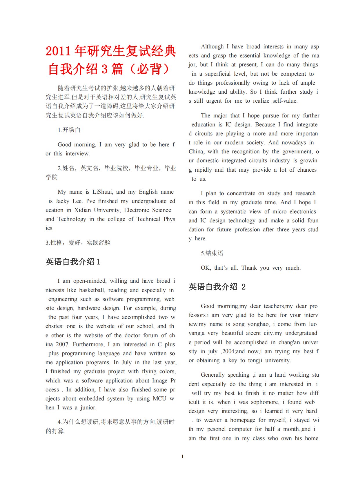12011年研究生复试经典自我介绍3篇(必背)随着研究生考试的扩张,越来越多的人朝着研究生进军.但是对于英语相对差的人,研究生复试英语自我介绍成为了一道障碍,这里将给大家介绍研究生复试英语自我介绍应该如何做好.1.开场白Goodmorning.Iamverygladtobehereforthisinterview.2.姓名,英文名,毕业院校,毕业专业,毕业学院MynameisLiShuai,andmyEnglishnameisJackyLee.I'vefinishedmyundergraduateeducationinXidianUniversity,ElectronicScienceandT...