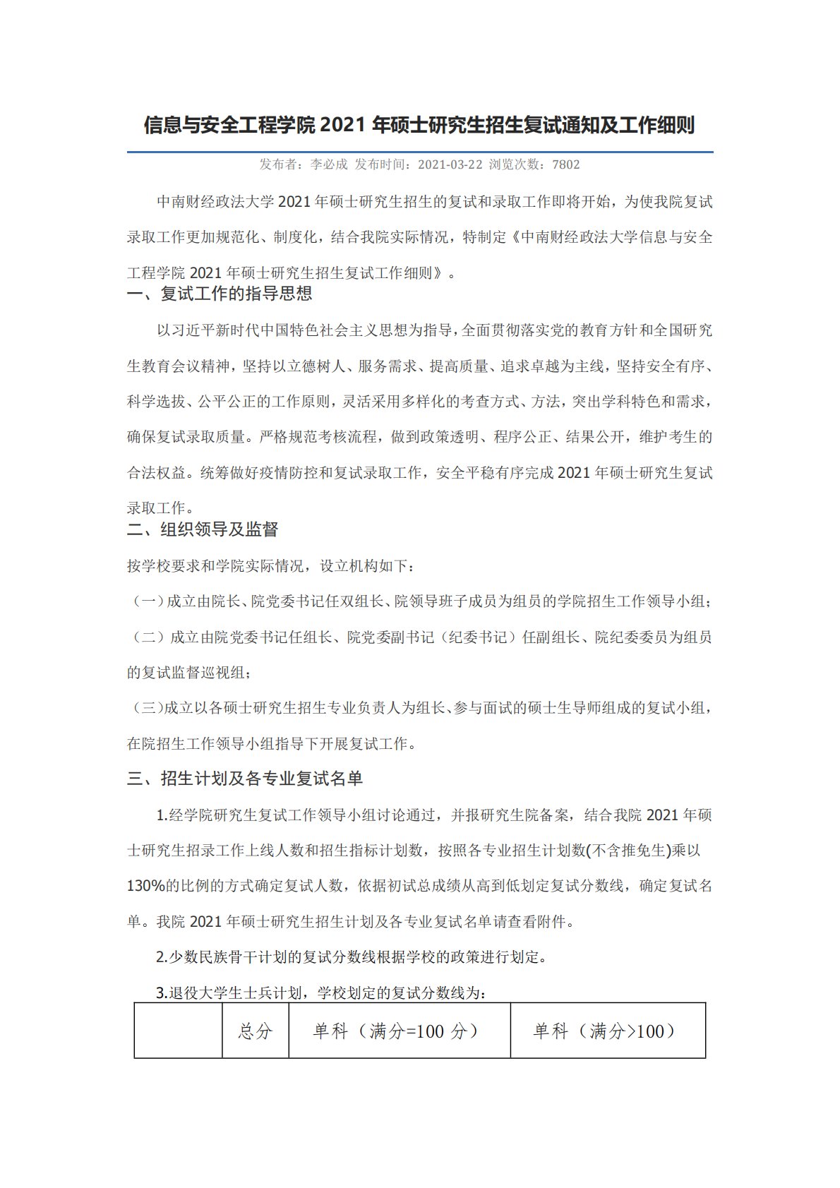 信息与安全工程学院2021年硕士研究生招生复试通知及工作细则发布者:李必成发布时间:2021-03-22浏览次数:7802中南财经政法大学2021年硕士研究生招生的复试和录取工作即将开始,为使我院复试录取工作更加规范化、制度化,结合我院实际情况,特制定《中南财经政法大学信息与安全工程学院2021年硕士研究生招生复试工作细则》。一、复试工作的指导思想以习近平新时代中国特色社会主义思想为指导,全面贯彻落实党的教育方针和全国研究生教育会议精神,坚持以立德树人、服务需求、提高质量、追求卓越为主线,坚持安全有序、科学选拔、公平公正的工作原则,灵活采用多样化的考查方式、方法,突出学科特色和需求,确保复试录...