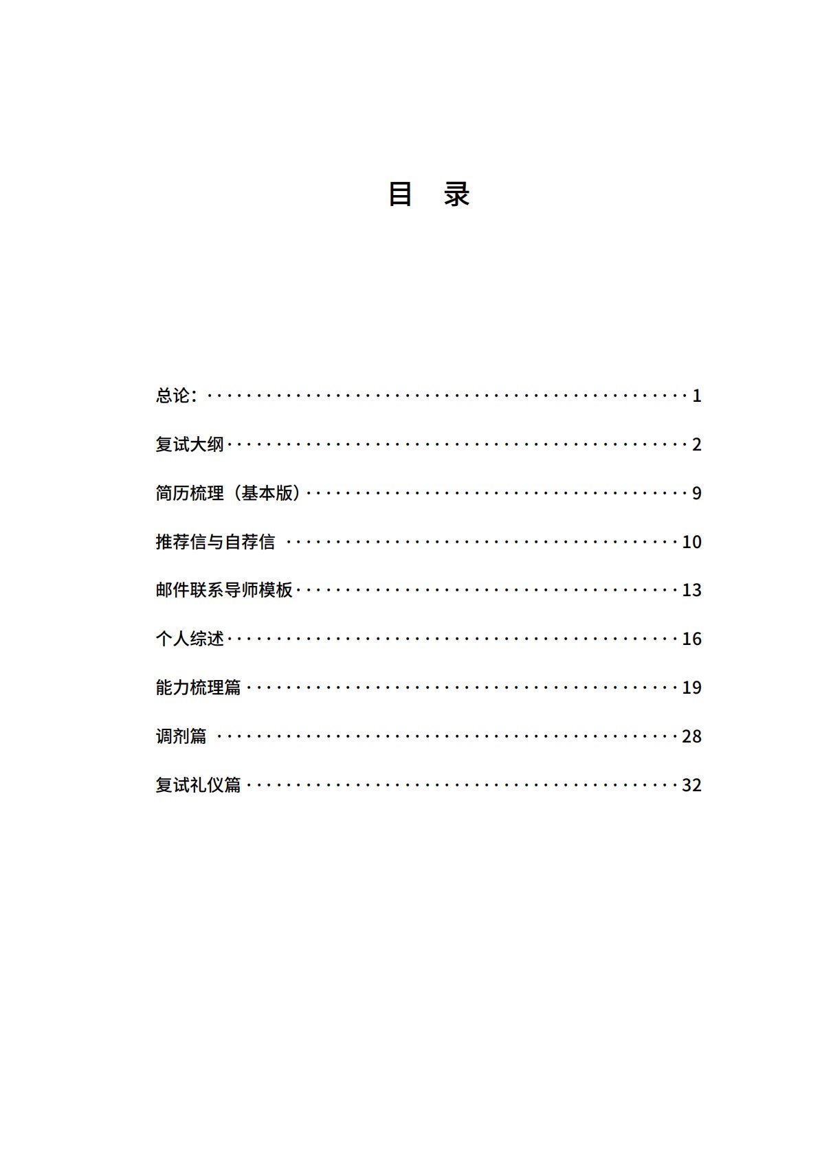 目 录总论:�������������������������������������������������1复试大纲�����������������������������������������������2简历梳理(基本版)���������������������������������������9推荐信与自荐信����������������������������������������10邮件联系导师模板���������������������������������������13个人综述�����������������������������������...