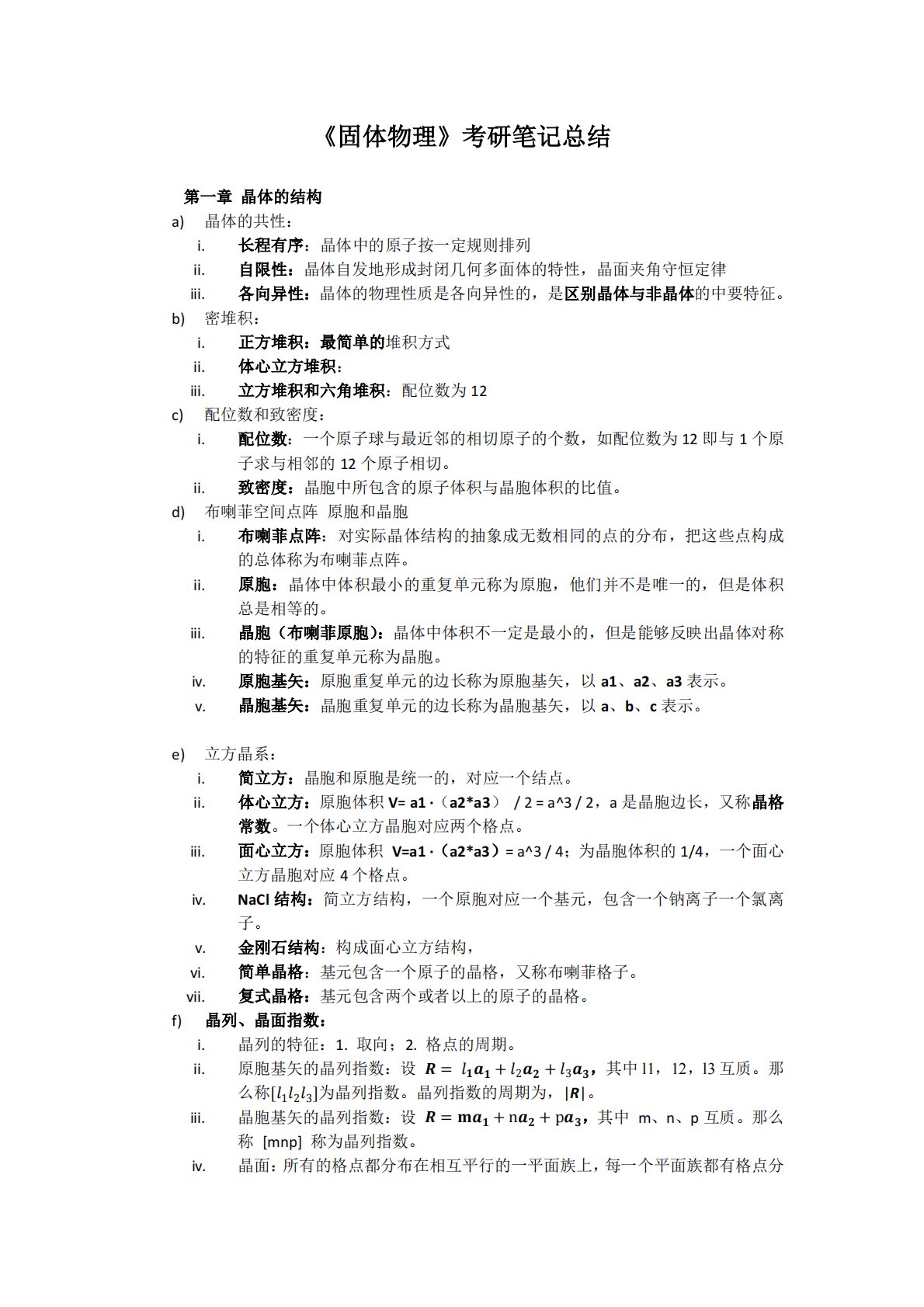 《固体物理》考研笔记总结第一章晶体的结构a)晶体的共性:i.长程有序:晶体中的原子按一定规则排列ii.自限性:晶体自发地形成封闭几何多面体的特性,晶面夹角守恒定律iii.各向异性:晶体的物理性质是各向异性的,是区别晶体与非晶体的中要特征。b)密堆积:i.正方堆积:最简单的堆积方式ii.体心立方堆积:iii.立方堆积和六角堆积:配位数为12c)配位数和致密度:i.配位数:一个原子球与最近邻的相切原子的个数,如配位数为12即与1个原子求与相邻的12个原子相切。ii.致密度:晶胞中所包含的原子体积与晶胞体积的比值。d)布喇菲空间点阵原胞和晶胞i.布喇菲点阵:对实际晶体结构的抽象成无数相同的点的分布,...
