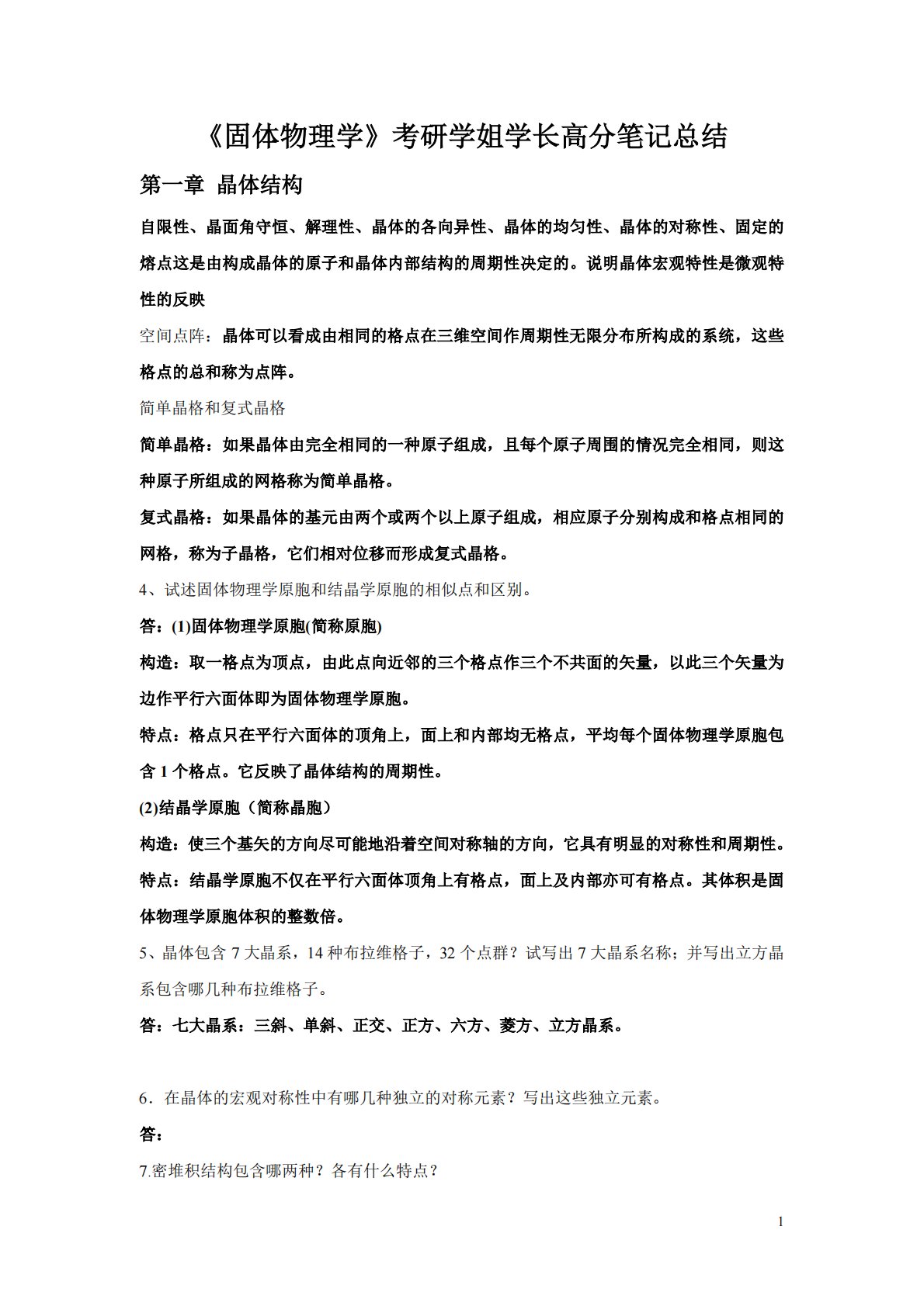 1《固体物理学》考研学姐学长高分笔记总结第一章晶体结构自限性、晶面角守恒、解理性、晶体的各向异性、晶体的均匀性、晶体的对称性、固定的熔点这是由构成晶体的原子和晶体内部结构的周期性决定的。说明晶体宏观特性是微观特性的反映空间点阵:晶体可以看成由相同的格点在三维空间作周期性无限分布所构成的系统,这些格点的总和称为点阵。简单晶格和复式晶格简单晶格:如果晶体由完全相同的一种原子组成,且每个原子周围的情况完全相同,则这种原子所组成的网格称为简单晶格。复式晶格:如果晶体的基元由两个或两个以上原子组成,相应原子分别构成和格点相同的网格,称为子晶格,它们相对位移而形成复式晶格。4、试述固体物理学原胞和结晶学原...