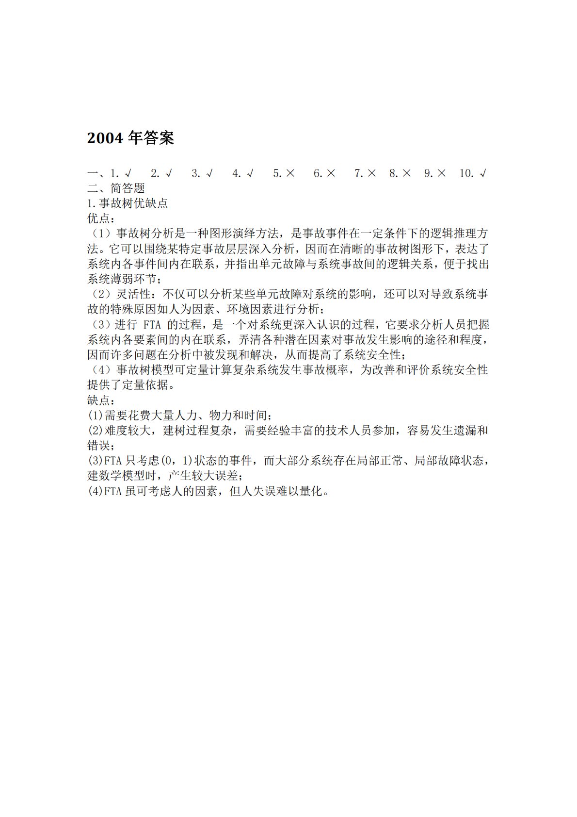 2004年答案一、1.√2.√3.√4.√5.×6.×7.×8.×9.×10.√二、简答题1.事故树优缺点优点:(1)事故树分析是一种图形演绎方法,是事故事件在一定条件下的逻辑推理方法。它可以围绕某特定事故层层深入分析,因而在清晰的事故树图形下,表达了系统内各事件间内在联系,并指出单元故障与系统事故间的逻辑关系,便于找出系统薄弱环节;(2)灵活性:不仅可以分析某些单元故障对系统的影响,还可以对导致系统事故的特殊原因如人为因素、环境因素进行分析;(3)进行FTA的过程,是一个对系统更深入认识的过程,它要求分析人员把握系统内各要素间的内在联系,弄清各种潜在因素对事故发生影响的途径和程度,因而许多问...