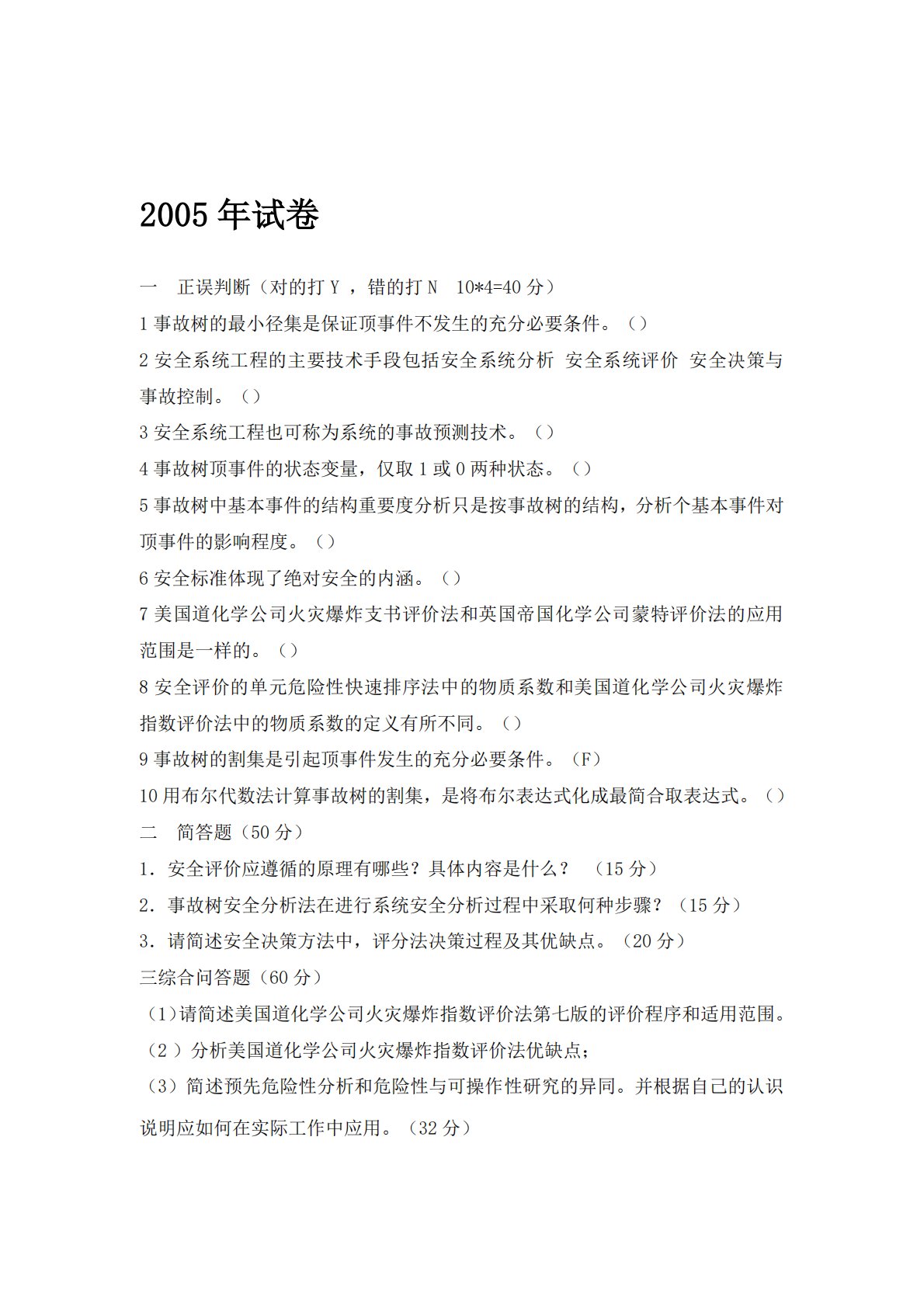 2005年试卷一正误判断(对的打Y,错的打N10*4=40分)1事故树的最小径集是保证顶事件不发生的充分必要条件。()2安全系统工程的主要技术手段包括安全系统分析安全系统评价安全决策与事故控制。()3安全系统工程也可称为系统的事故预测技术。()4事故树顶事件的状态变量,仅取1或0两种状态。()5事故树中基本事件的结构重要度分析只是按事故树的结构,分析个基本事件对顶事件的影响程度。()6安全标准体现了绝对安全的内涵。()7美国道化学公司火灾爆炸支书评价法和英国帝国化学公司蒙特评价法的应用范围是一样的。()8安全评价的单元危险性快速排序法中的物质系数和美国道化学公司火灾爆炸指数评价法中的物质系数的...