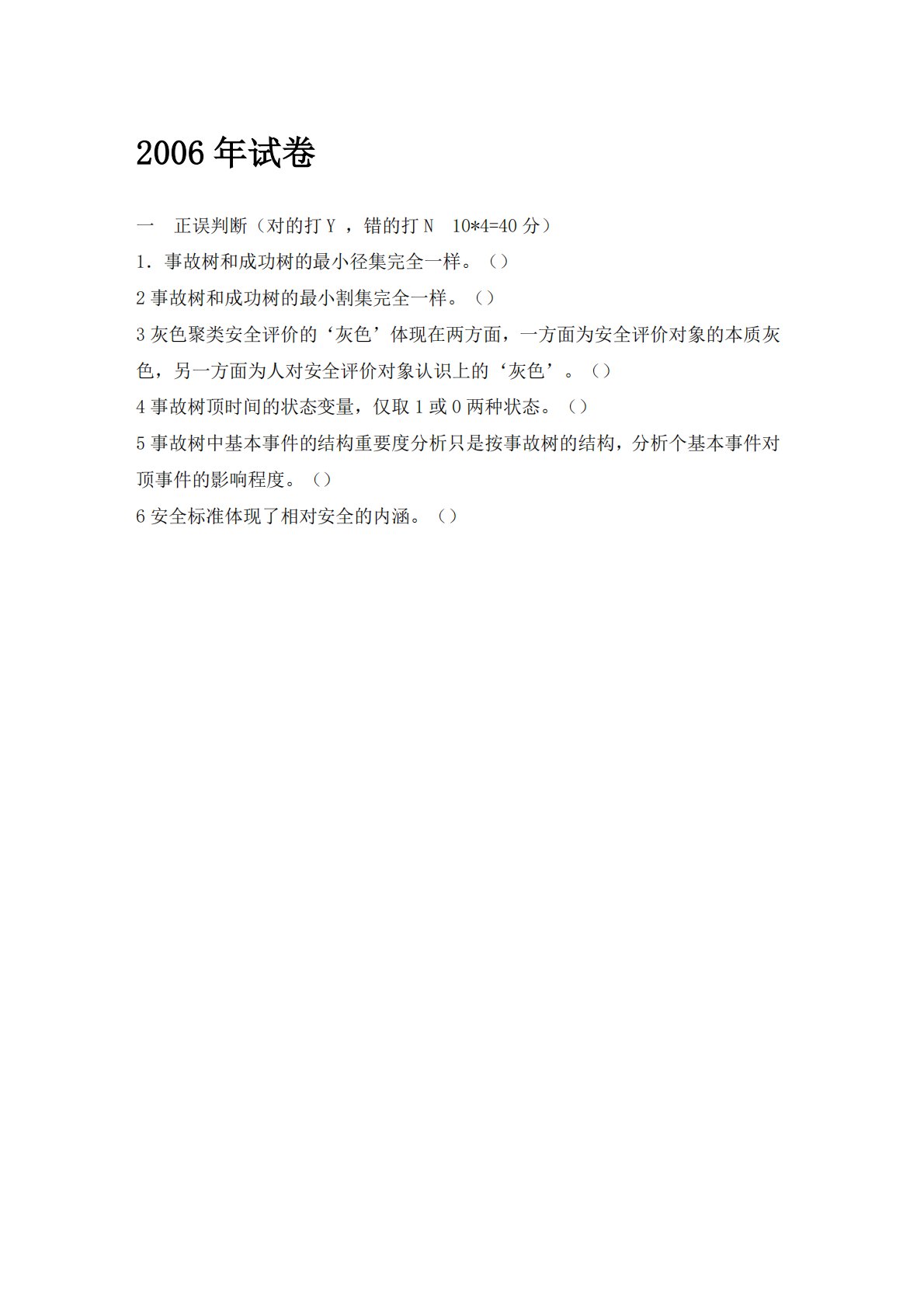2006年试卷一正误判断(对的打Y,错的打N10*4=40分)1.事故树和成功树的最小径集完全一样。()2事故树和成功树的最小割集完全一样。()3灰色聚类安全评价的‘灰色’体现在两方面,一方面为安全评价对象的本质灰色,另一方面为人对安全评价对象认识上的‘灰色’。()4事故树顶时间的状态变量,仅取1或0两种状态。()5事故树中基本事件的结构重要度分析只是按事故树的结构,分析个基本事件对顶事件的影响程度。()6安全标准体现了相对安全的内涵。()2006年试卷一正误判断(对的打Y,错的打N10*4=40分)1.事故树和成功树的最小径集完全一样。()2事故树和成功树的最小割集完全一样。()3灰色聚类安...