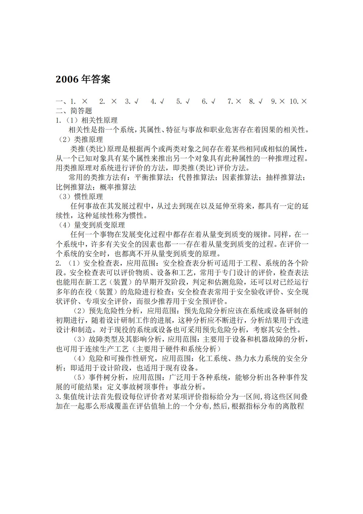 2006年答案2.×3.√4.√5.√6.√7.×8.√9.×10.×一、1.×二、简答题1.(1)相关性原理相关性是指一个系统,其属性、特征与事故和职业危害存在着因果的相关性。(2)类推原理类推(类比)原理是根据两个或两类对象之间存在着某些相同或相似的属性,从一个已知对象具有某个属性来推出另一个对象具有此种属性的一种推理过程。用类推原理对系统进行评价的方法,即类推(类比)评价方法。常用的类推方法有:平衡推算法;代替推算法;因素推算法;抽样推算法;比例推算法;概率推算法(3)惯性原理任何事故在其发展过程中,从过去到现在以及延伸至将来,都具有一定的延续性,这种延续性称为惯性。(4)量变到质变原理...