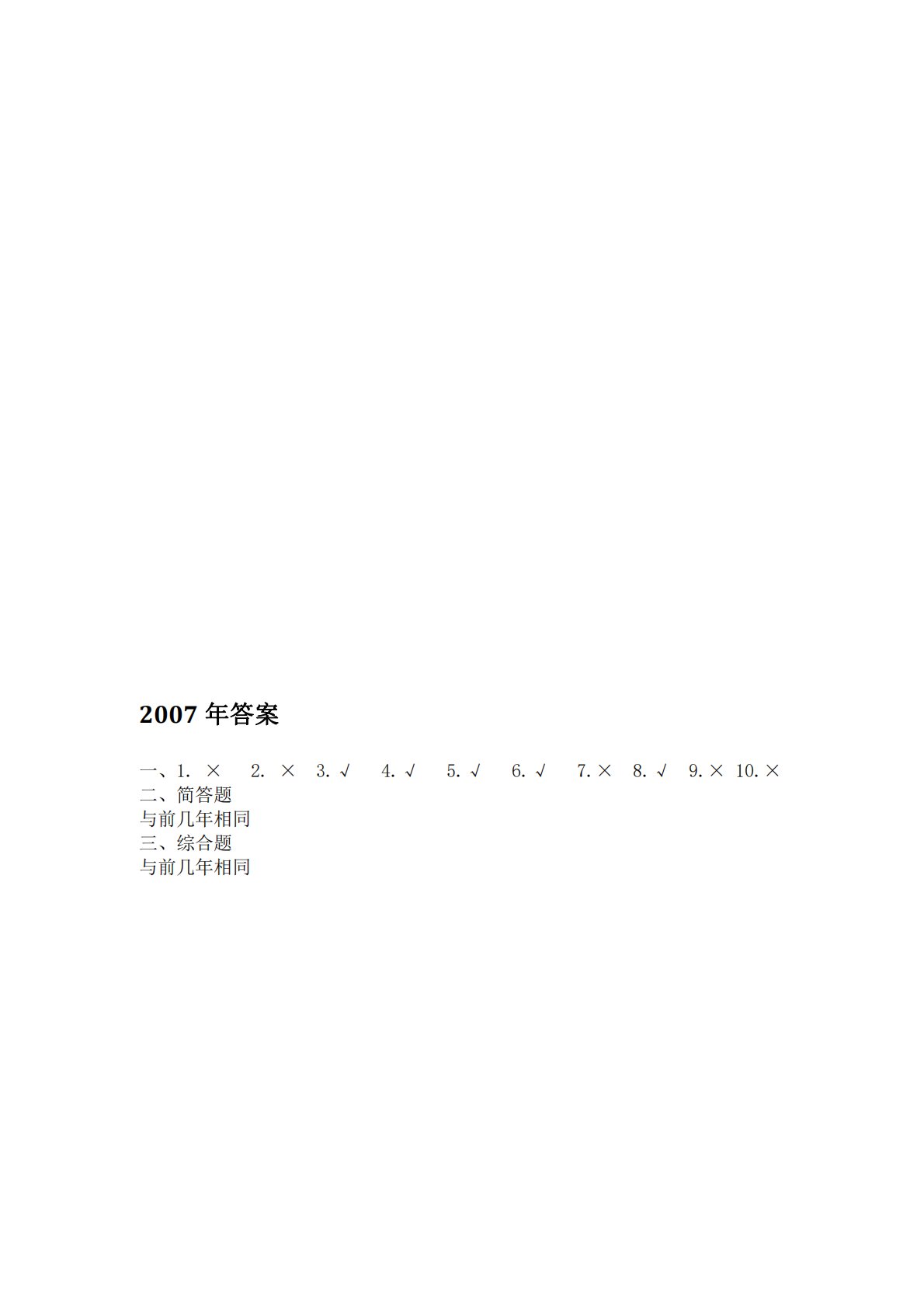 2007年答案一、1.×2.×3.√4.√5.√6.√7.×8.√9.×10.×二、简答题与前几年相同三、综合题与前几年相同百校文库—海量高校资料共享库百校文库是一个线上大学生专业学习资料共享平台,致力于通过用户自主上传与分享,打造一个涵盖各大高校、各学科门类的免费资源中心。平台已积累50万+套历年真题与100万+条学习文档,覆盖绝大多数高校专业,所有资料均由各大高校学生自主上传。✅资料透明,直观预览新增全站资料目录功能,所有资源分类清晰、一目了然。访问在线目录,即可快速浏览平台资源全貌,了解资料覆盖范围。点击查看实时更新的资源总览:【百校文库最新资料目录】✅严格审核,保障基础质量为确保内容可...