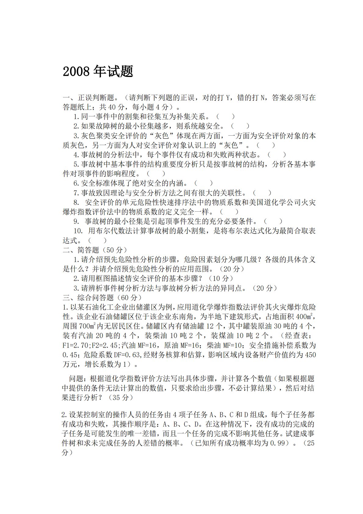 2008年试题一、正误判断题。(请判断下列题的正误,对的打Y,错的打N,答案必须写在答题纸上;共40分,每小题4分)。1.同一事件中的割集和径集互为补集关系。()2.如果故障树的最小径集越多,则系统越安全。()3.灰色聚类安全评价的“灰色”体现在两方面,一方面为安全评价对象的本质灰色,另一方面为人对安全评价对象认识上的“灰色”。()4.事故树的分析法中,每个事件仅有成功和失败两种状态。()5.事故树中基本事件的结构重要度分析只是按事故树的结构,分析各基本事件对顶事件的影响程度。()6.安全标准体现了绝对安全的内涵。()7.事故致因理论与安全分析方法之间有很大的关联性。()8.安全评价的单元危险...