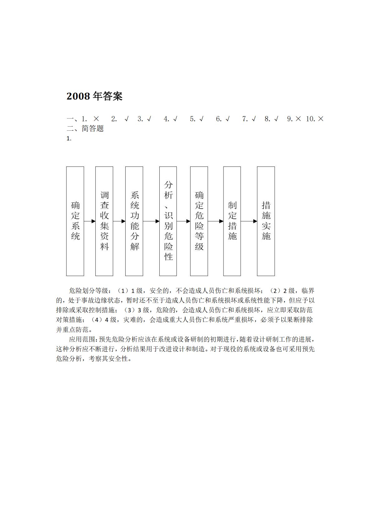 2008年答案2.√3.√4.√5.√6.√7.√8.√9.×10.×一、1.×二、简答题1.应用范围:预先危险分析应该在系统或设备研制的初期进行,随着设计研制工作的进展,这种分析应不断进行,分析结果用于改进设计和制造。对于现役的系统或设备也可采用预先危险划分等级:(1)1级,安全的,不会造成人员伤亡和系统损坏;(2)2级,临界的,处于事故边缘状态,暂时还不至于造成人员伤亡和系统损坏或系统性能下降,但应予以排除或采取控制措施;(3)3级,危险的,会造成人员伤亡和系统损坏,应立即采取防范对策措施;(4)4级,灾难的,会造成重大人员伤亡和系统严重损坏,必须予以果断排除并重点防范。危险分析,考察其安...
