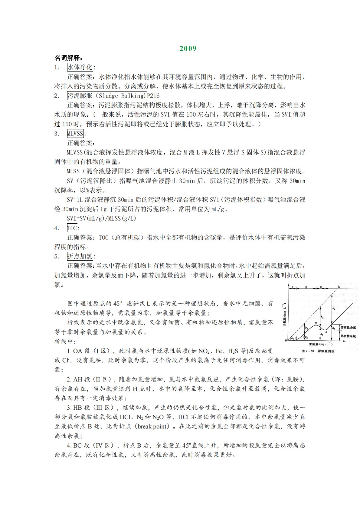 2009名词解释:1.水体净化:正确答案:水体净化指水体能够在其环境容量范围内,通过物理、化学、生物的作用,将排入的污染物质分散、分离或分解,使水体基本上或完全恢复到原来状态的过程。2.污泥膨胀(SludgeBulking)P216正确答案:污泥膨胀指污泥结构极度松散,体积增大,上浮,难于沉降分离,影响出水水质的现象。(一般来说,活性污泥的SV1值在100左右时,其沉降性能最佳,当SVI值超过150时,预示着活性污泥即将或已经处于膨胀状态,应立即予以处理。)3.MLVSS:正确答案:MLVSS(混合液挥发性悬浮液体浓度,混合M液L挥发性V悬浮S固体S)指混合液悬浮固体中的有机物的重量。MLSS...