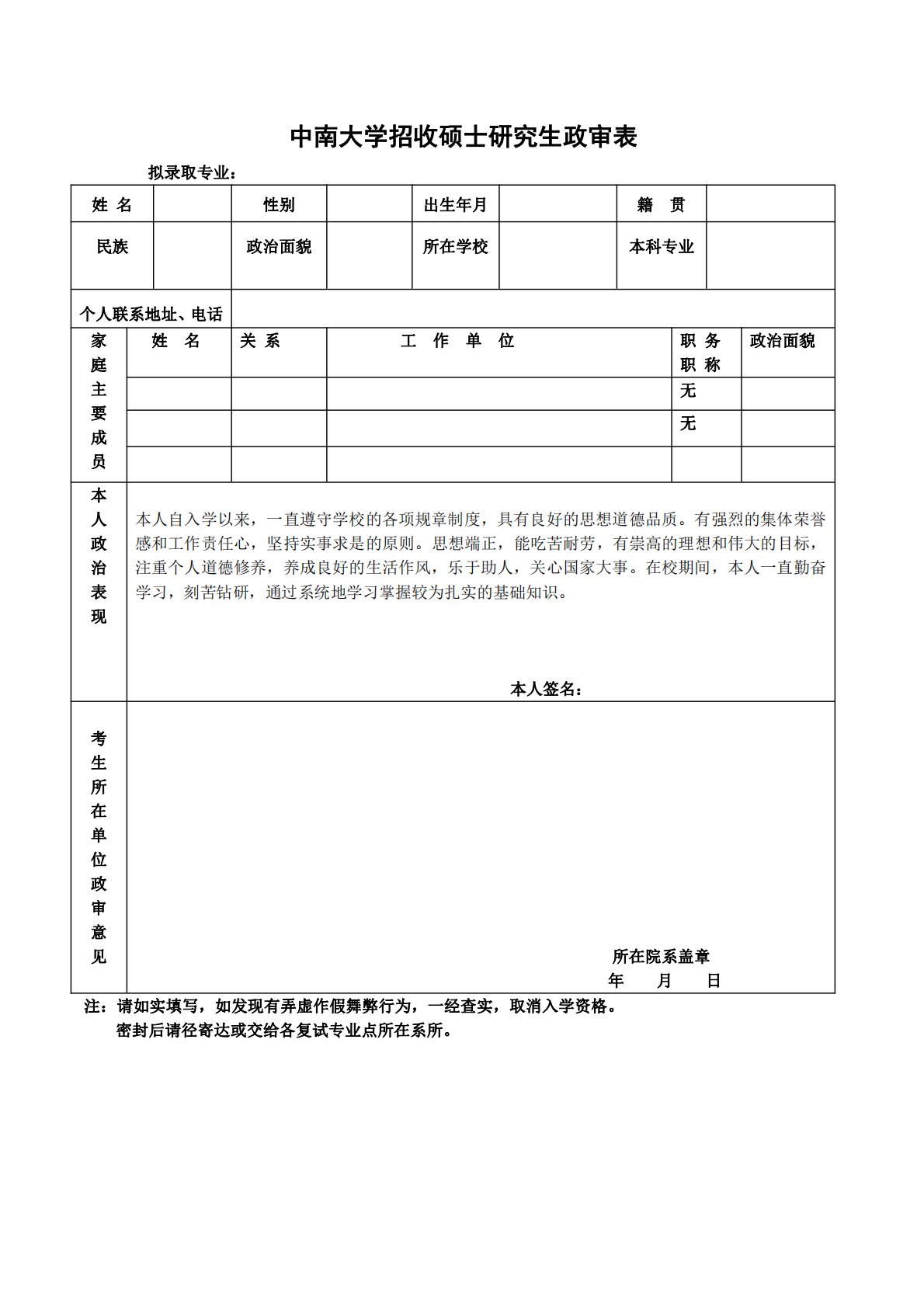中南大学招收硕士研究生政审表拟录取专业:姓名性别出生年月籍贯民族政治面貌所在学校本科专业个人联系地址、电话家庭主要成员姓名关系工作单位职务职称政治面貌无无本人政治表现本人自入学以来,一直遵守学校的各项规章制度,具有良好的思想道德品质。有强烈的集体荣誉感和工作责任心,坚持实事求是的原则。思想端正,能吃苦耐劳,有崇高的理想和伟大的目标,注重个人道德修养,养成良好的生活作风,乐于助人,关心国家大事。在校期间,本人一直勤奋学习,刻苦钻研,通过系统地学习掌握较为扎实的基础知识。本人签名:考生所在单位政审意见所在院系盖章年月日注:请如实填写,如发现有弄虚作假舞弊行为,一经查实,取消入学资格。密封后请径寄达...