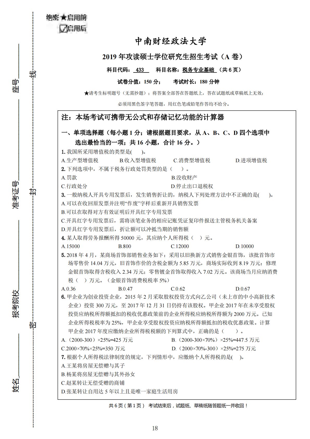 中南财经政法大学433税务专业基础2019年真题A卷