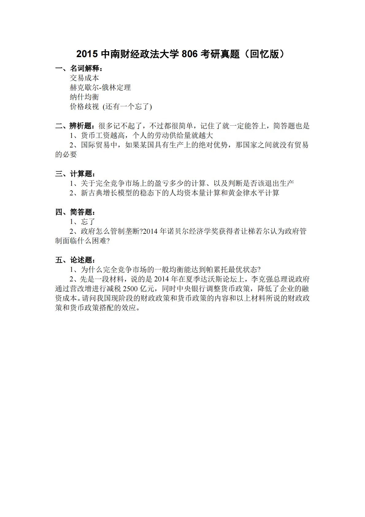 2015中南财经政法大学806考研真题(回忆版)一、名词解释:交易成本赫克歇尔-俄林定理纳什均衡价格歧视(还有一个忘了)二、辨析题:很多记不起了,不过都很简单,记住了就一定能答上,简答题也是1、货币工资越高,个人的劳动供给量就越大2、国际贸易中,如果某国具有生产上的绝对优势,那国家之间就没有贸易的必要三、计算题:1、关于完全竞争市场上的盈亏多少的计算、以及判断是否该退出生产2、新古典增长模型的稳态下的人均资本量计算和黄金律水平计算四、简答题:1、忘了2、政府怎么管制垄断?2014年诺贝尔经济学奖获得者让梯若尔认为政府管制面临什么困难?五、论述题:1、为什么完全竞争市场的一般均衡能达到帕累托最优...