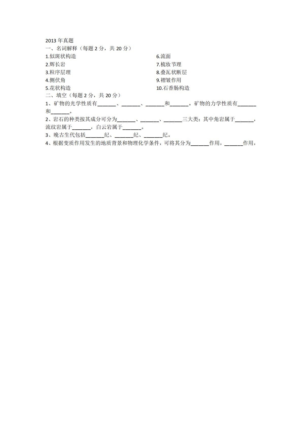 2013年真题一、名词解释(每题2分,共20分)1.似斑状构造2.辉长岩3.粒序层理4.侧伏角5.花状构造6.流面7.梳妆节理8.叠瓦状断层9.褶皱作用10.石香肠构造二、填空(每题2分,共20分)1、矿物的光学性质有_______、_______、_______和_______。矿物的力学性质有_______和_______。2、岩石的种类按其成分可分为_______、_______、_______三大类;其中角岩属于_______,流纹岩属于_______,白云岩属于_______。3、晚古生代包括_______纪、_______纪、_______纪。4、根据变质作用发生的地质背景和物理化...