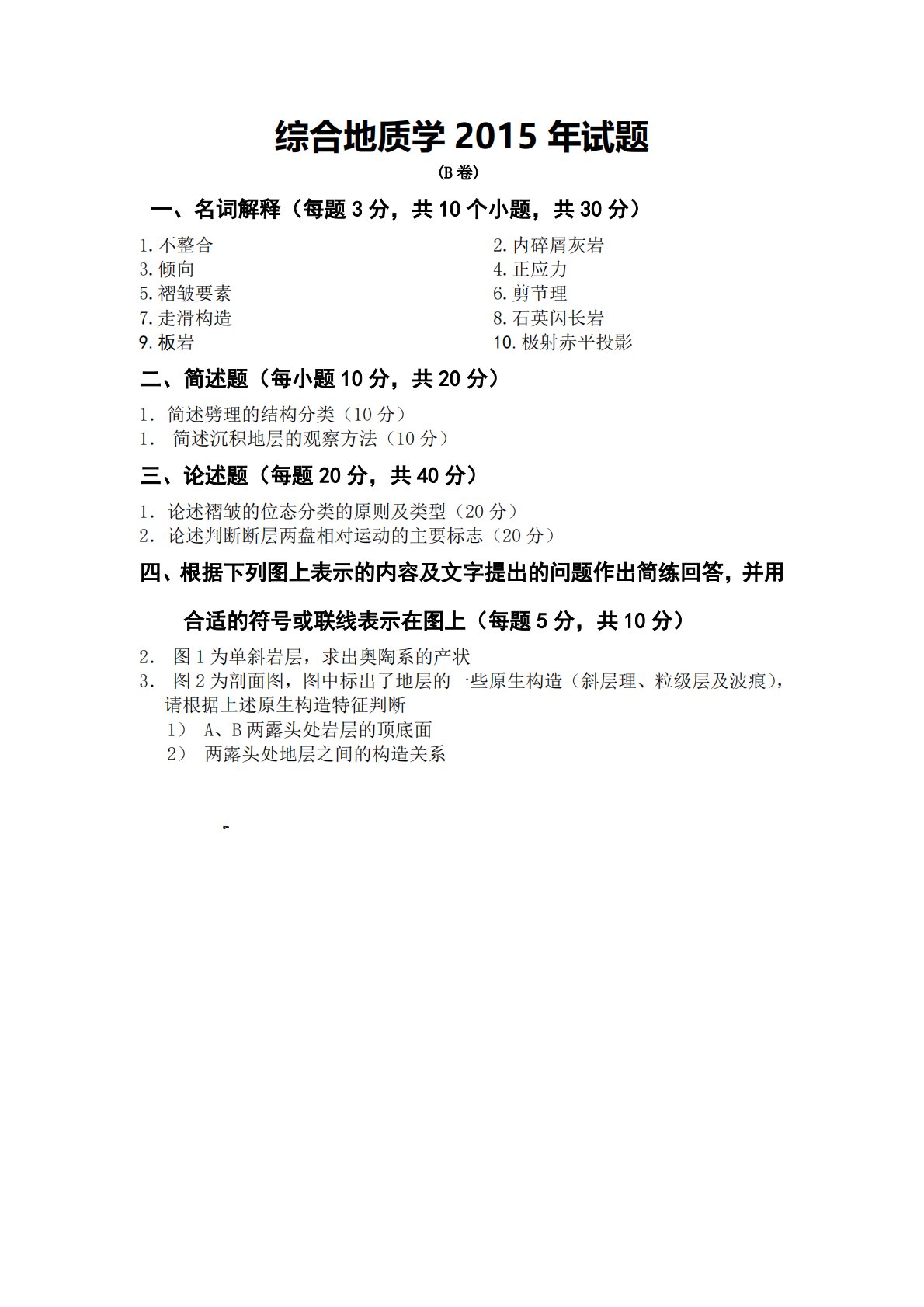 综合地质学2015年试题(B卷)一、名词解释(每题3分,共10个小题,共30分)1.不整合2.内碎屑灰岩3.倾向4.正应力5.褶皱要素6.剪节理7.走滑构造8.石英闪长岩9.板岩10.极射赤平投影二、简述题(每小题10分,共20分)1.简述劈理的结构分类(10分)1.简述沉积地层的观察方法(10分)三、论述题(每题20分,共40分)1.论述褶皱的位态分类的原则及类型(20分)2.论述判断断层两盘相对运动的主要标志(20分)四、根据下列图上表示的内容及文字提出的问题作出简练回答,并用合适的符号或联线表示在图上(每题5分,共10分)2.图1为单斜岩层,求出奥陶系的产状3.图2为剖面图,图中标出了地...