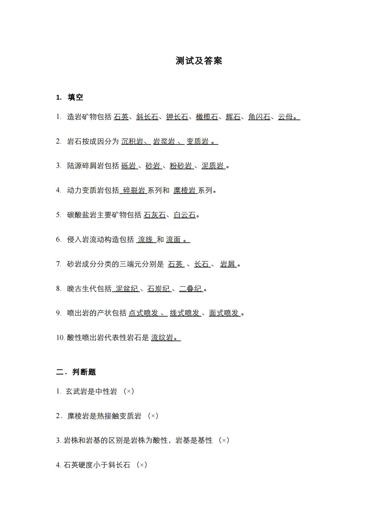 1.填空1.造岩矿物包括石英、斜长石、钾长石、橄榄石、辉石、角闪石、云母。2.岩石按成因分为沉积岩、岩浆岩、变质岩。3.陆源碎屑岩包括砾岩、砂岩、粉砂岩、泥质岩。4.动力变质岩包括碎裂岩系列和糜棱岩系列。5.碳酸盐岩主要矿物包括石灰石、白云石。6.侵入岩流动构造包括流线和流面。7.砂岩成分分类的三端元分别是石英、长石、岩屑。8.晚古生代包括泥盆纪、石炭纪、二叠纪。9.喷出岩的产状包括点式喷发、线式喷发、面式喷发。10.酸性喷出岩代表性岩石是流纹岩。²âÊÔ¼°答案二.判断题1.玄武岩是中性岩(×)2.糜棱岩是热接触变质岩(×)3.岩株和岩基的区别是岩株为酸性,岩基是基性(×)4.石英硬度小于斜...