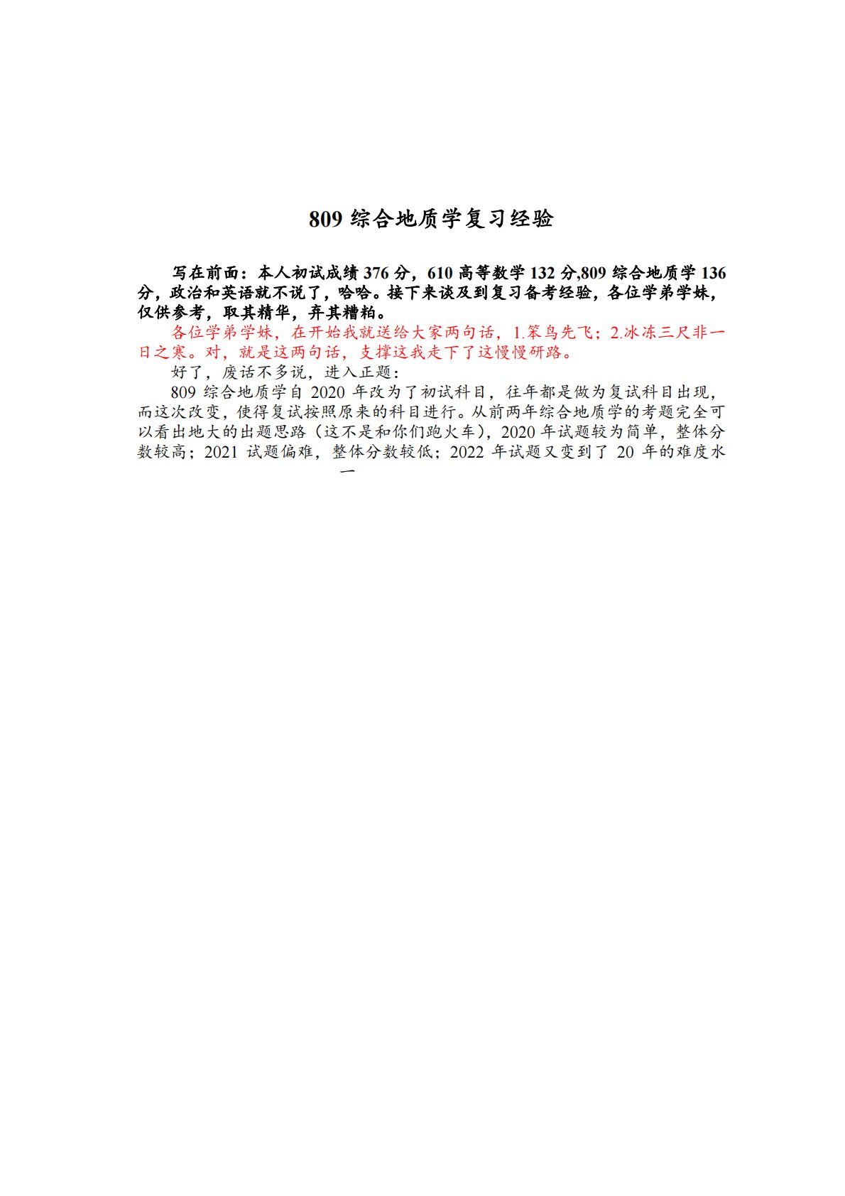 809综合地质学复习经验写在前面:本人初试成绩376分,610高等数学132分,809综合地质学136分,政治和英语就不说了,哈哈。接下来谈及到复习备考经验,各位学弟学妹,仅供参考,取其精华,弃其糟粕。各位学弟学妹,在开始我就送给大家两句话,1.笨鸟先飞;2.冰冻三尺非一日之寒。对,就是这两句话,支撑这我走下了这慢慢研路。好了,废话不多说,进入正题:809综合地质学自2020年改为了初试科目,往年都是做为复试科目出现,而这次改变,使得复试按照原来的科目进行。从前两年综合地质学的考题完全可以看出地大的出题思路(这不是和你们跑火车),2020年试题较为简单,整体分数较高;2021试题偏难,整体分数...