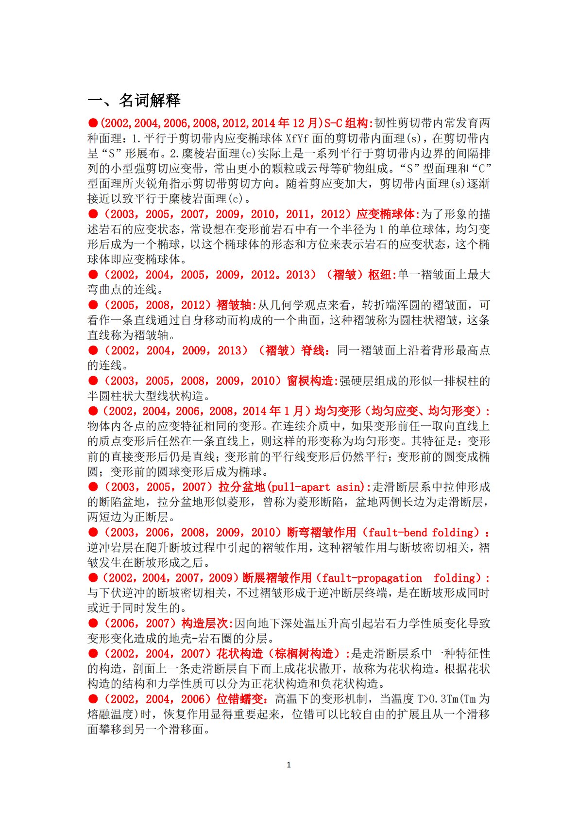 1一、名词解释●(2002,2004,2006,2008,2012,2014年12月)S-C组构:韧性剪切带内常发育两种面理:1.平行于剪切带内应变椭球体XfYf面的剪切带内面理(s),在剪切带内呈“S”形展布。2.糜棱岩面理(c)实际上是一系列平行于剪切带内边界的间隔排列的小型强剪切应变带,常由更小的颗粒或云母等矿物组成。“S”型面理和“C”型面理所夹锐角指示剪切带剪切方向。随着剪应变加大,剪切带内面理(s)逐渐接近以致平行于糜棱岩面理(c)。●(2003,2005,2007,2009,2010,2011,2012)应变椭球体:为了形象的描述岩石的应变状态,常设想在变形前岩石中有一个半径为1...