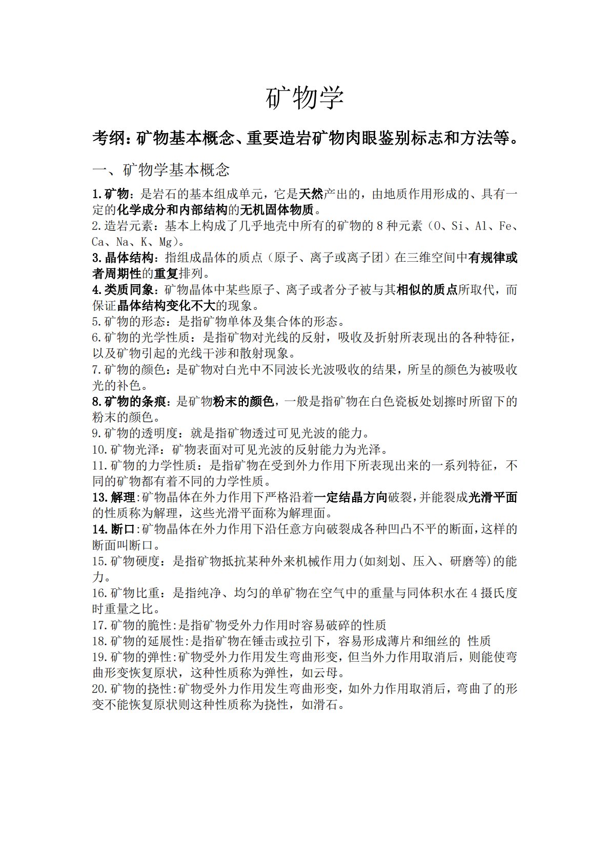 矿物学考纲:矿物基本概念、重要造岩矿物肉眼鉴别标志和方法等。一、矿物学基本概念1.矿物:是岩石的基本组成单元,它是天然产出的,由地质作用形成的、具有一定的化学成分和内部结构的无机固体物质。2.造岩元素:基本上构成了几乎地壳中所有的矿物的8种元素(O、Si、Al、Fe、Ca、Na、K、Mg)。3.晶体结构:指组成晶体的质点(原子、离子或离子团)在三维空间中有规律或者周期性的重复排列。4.类质同象:矿物晶体中某些原子、离子或者分子被与其相似的质点所取代,而保证晶体结构变化不大的现象。5.矿物的形态:是指矿物单体及集合体的形态。6.矿物的光学性质:是指矿物对光线的反射,吸收及折射所表现出的各种特征,...