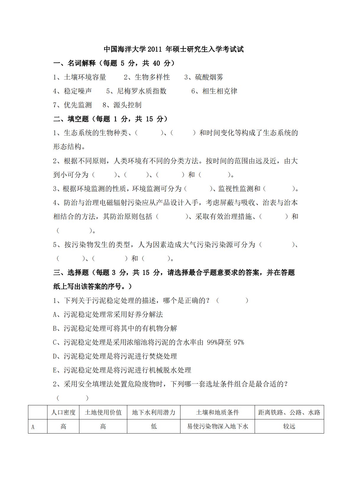 中国海洋大学2011年硕士研究生入学考试试一、名词解释(每题5分,共40分)1、土壤环境容量2、生物多样性3、硫酸烟雾4、稳定噪声5、尼梅罗水质指数6、相生相克律7、优先监测8、源头控制二、填空题(每题1分,共15分)1、生态系统的生物种类、()、()和时间变化等构成了生态系统的形态结构。2、根据不同原则,人类环境有不同的分类方法。按时间的范围由远及近,由大到小可分为()、()、()和()。3、根据环境监测的性质,环境监测可分为()、监视性监测和()。4、防治与治理电磁辐射污染应从产品设计入手,考虑屏蔽与吸收、治表与治本相结合的方法,其防治原则包括()、采取有效治理措施、()和()。5、按污染...