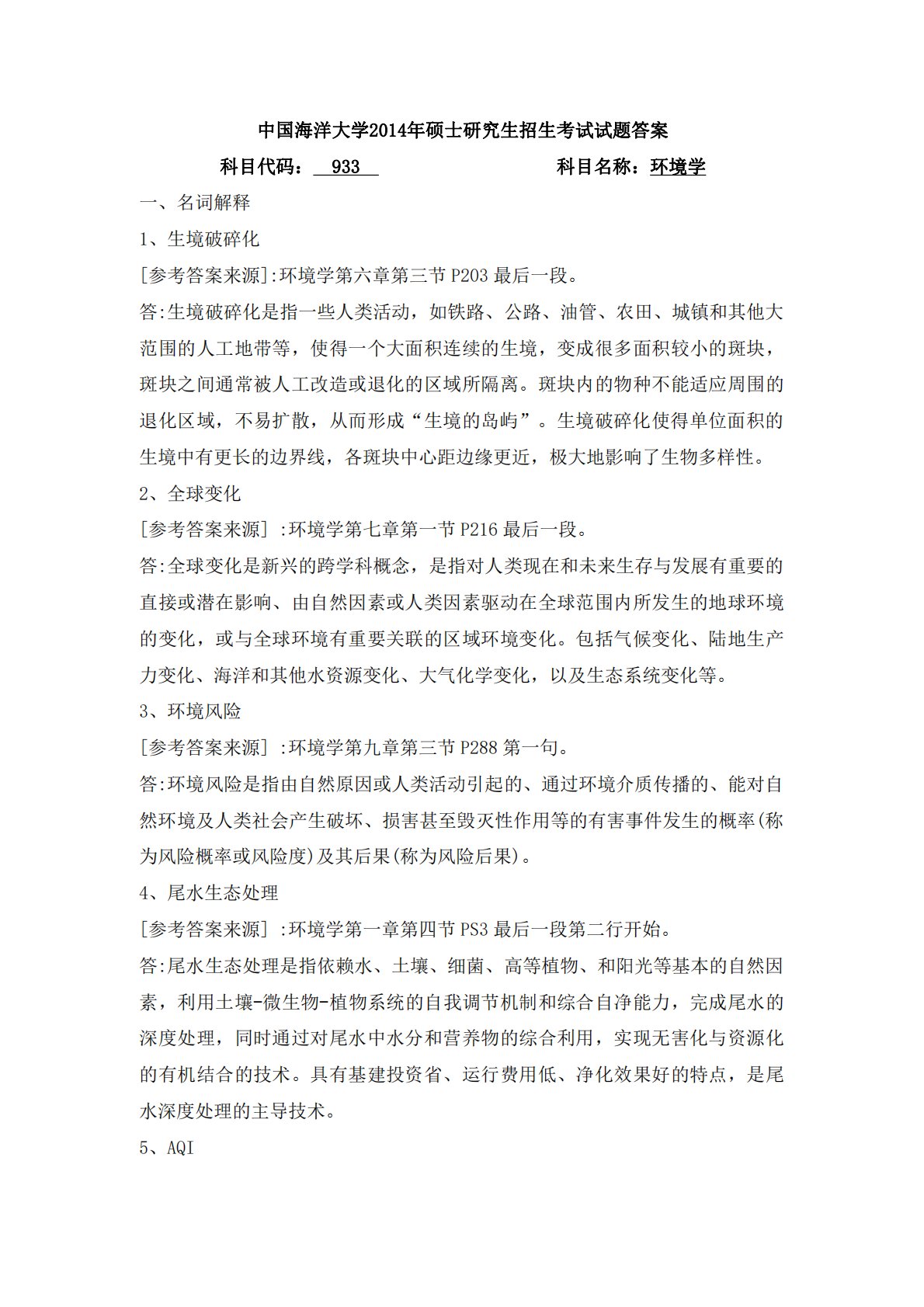 中国海洋大学2014年硕士研究生招生考试试题答案科目代码:933科目名称:环境学一、名词解释1、生境破碎化[参考答案来源]:环境学第六章第三节P203最后一段。答:生境破碎化是指一些人类活动,如铁路、公路、油管、农田、城镇和其他大范围的人工地带等,使得一个大面积连续的生境,变成很多面积较小的斑块,斑块之间通常被人工改造或退化的区域所隔离。斑块内的物种不能适应周围的退化区域,不易扩散,从而形成“生境的岛屿”。生境破碎化使得单位面积的生境中有更长的边界线,各斑块中心距边缘更近,极大地影响了生物多样性。2、全球变化[参考答案来源]:环境学第七章第一节P216最后一段。答:全球变化是新兴的跨学科概念,...