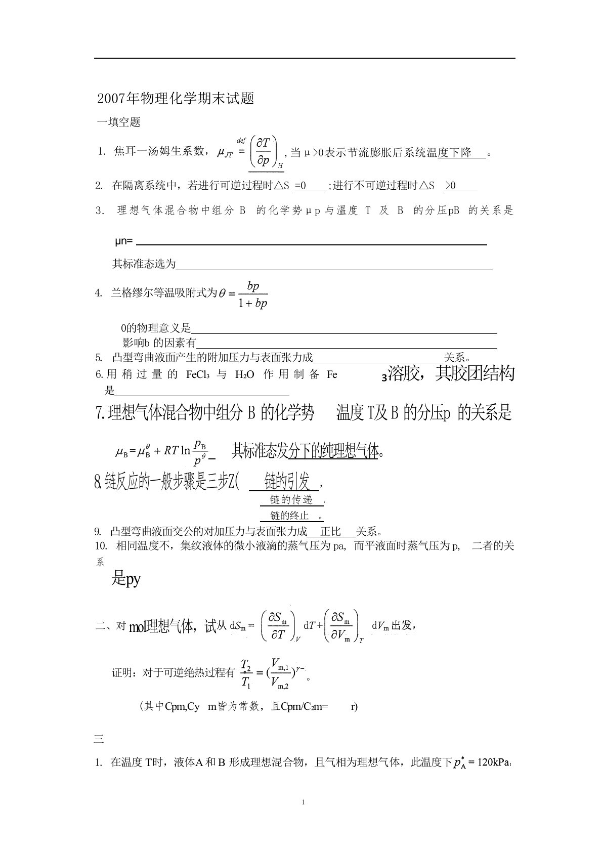 2007年物理化学期末试题一填空题1.焦耳一汤姆生系数,,当μ>0表示节流膨胀后系统温度下降。2.在隔离系统中,若进行可逆过程时△S=0;进行不可逆过程时△S>03.理想气体混合物中组分B的化学势μp与温度T及B的分压pB的关系是μn=其标准态选为4.兰格缪尔等温吸附式为0的物理意义是影响b的因素有5.凸型弯曲液面产生的附加压力与表面张力成关系。6.用稍过量的FeCl₃与H₂O作用制备Fe₃溶胶,其胶团结构是7.理想气体混合物中组分B的化学势温度T及B的分压p的关系是其标准态发分下的纯理想气体。8.链反应的一般步骤是三步Z(链的引发,链的传递,9.凸型弯曲液面交公的对加压力与表面张力成正比关系...