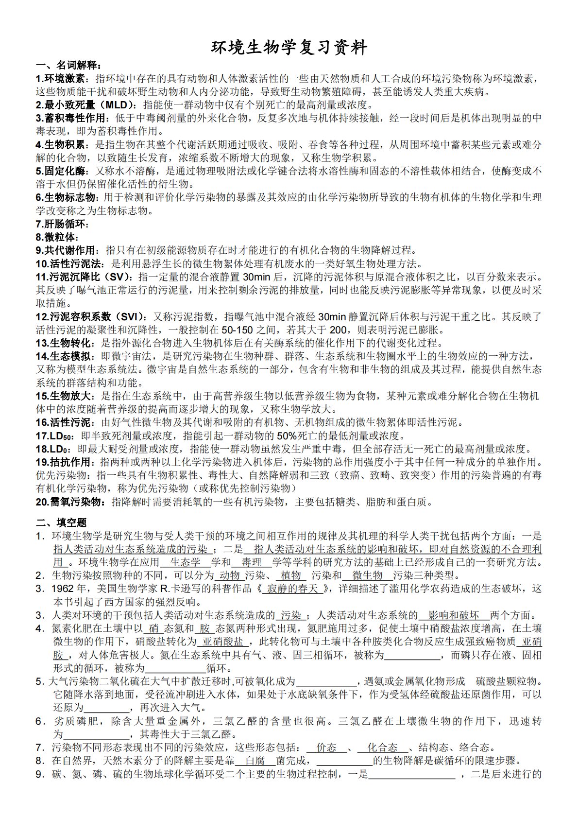 环境生物学复习资料一、名词解释:1.环境激素:指环境中存在的具有动物和人体激素活性的一些由天然物质和人工合成的环境污染物称为环境激素,这些物质能干扰和破坏野生动物和人内分泌功能,导致野生动物繁殖障碍,甚至能诱发人类重大疾病。2.最小致死量(MLD):指能使一群动物中仅有个别死亡的最高剂量或浓度。3.蓄积毒性作用:低于中毒阈剂量的外来化合物,反复多次地与机体持续接触,经一段时间后是机体出现明显的中毒表现,即为蓄积毒性作用。4.生物积累:是指生物在其整个代谢活跃期通过吸收、吸附、吞食等各种过程,从周围环境中蓄积某些元素或难分解的化合物,以致随生长发育,浓缩系数不断增大的现象,又称生物学积累。5.固...