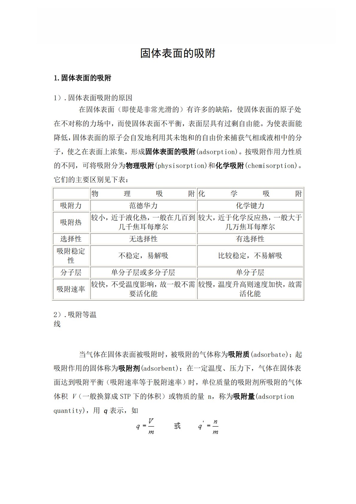 固体表面的吸附1.固体表面的吸附1).固体表面吸附的原因在固体表面(即使是非常光滑的)有许多的缺陷,使固体表面的原子处在不对称的力场中,而使固体表面不平衡,表面层具有过剩自由能。为使表面能降低,固体表面的原子会自发地利用其未饱和的自由价来捕获气相或液相中的分子,使之在表面上浓集,形成固体表面的吸附(adsorption)。按吸附作用力性质的不同,可将吸附分为物理吸附(physisorption)和化学吸附(chemisorption)。它们的主要区别见下表:物理吸附化学吸附吸附力范德华力化学键力吸附热较小,近于液化热,一般在几百到几千焦耳每摩尔较大,近于化学反应热,一般大于几万焦耳每摩尔选择性...