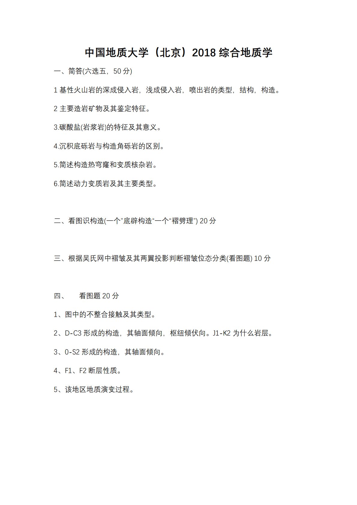 中国地)大学(北京)2018综合地)学一、简答(六选五,50分)1基性火山岩的深成侵入岩,浅成侵入岩,喷出岩的类型,结构,构造。2主要造岩矿物及其鉴定特征。3.碳酸盐(岩浆岩)的特征及其意义。4.沉积底砾岩与构造角砾岩的区别。5.简述构造热穹窿和变质核杂岩。6.简述动力变质岩及其主要类型。二、看图识构造(一个”底辟构造“一个“褶劈理”)20分三、根据吴氏网中褶皱及其两翼投影判断褶皱位态分类(看图题)10分四、看图题20分1、图中的不整合接触及其类型。2、D-C3形成的构造,其轴面倾向,枢纽倾伏向。J1-K2为什么岩层。3、0-S2形成的构造,其轴面倾向。4、F1、F2断层性质。5、该地区地质演...
