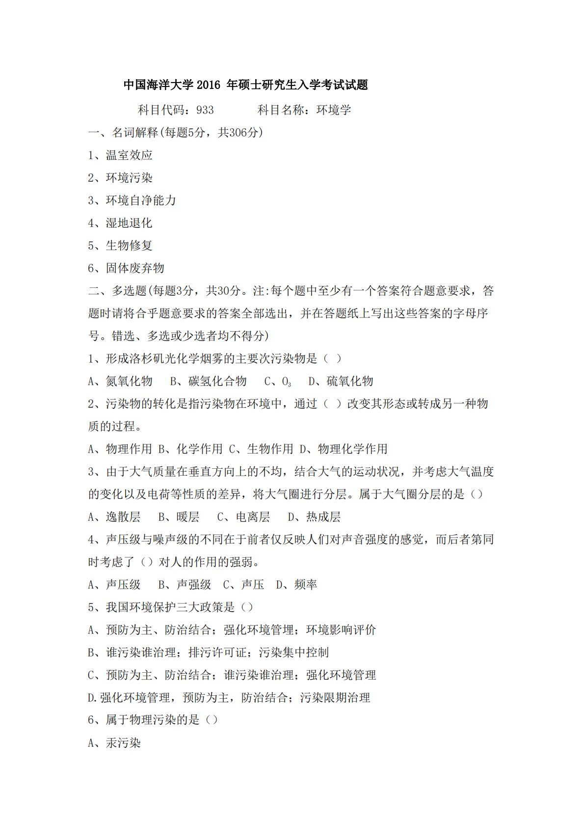 中国海洋大学2016年硕士研究生入学考试试题科目代码:933科目名称:环境学一、名词解释(每题5分,共306分)1、温室效应2、环境污染3、环境自净能力4、湿地退化5、生物修复6、固体废弃物二、多选题(每题3分,共30分。注:每个题中至少有一个答案符合题意要求,答题时请将合乎题意要求的答案全部选出,并在答题纸上写出这些答案的字母序号。错选、多选或少选者均不得分)1、形成洛杉矶光化学烟雾的主要次污染物是()A、氮氧化物B、碳氢化合物C、O3D、硫氧化物2、污染物的转化是指污染物在环境中,通过()改变其形态或转成另一种物质的过程。A、物理作用B、化学作用C、生物作用D、物理化学作用3、由于大气质量...