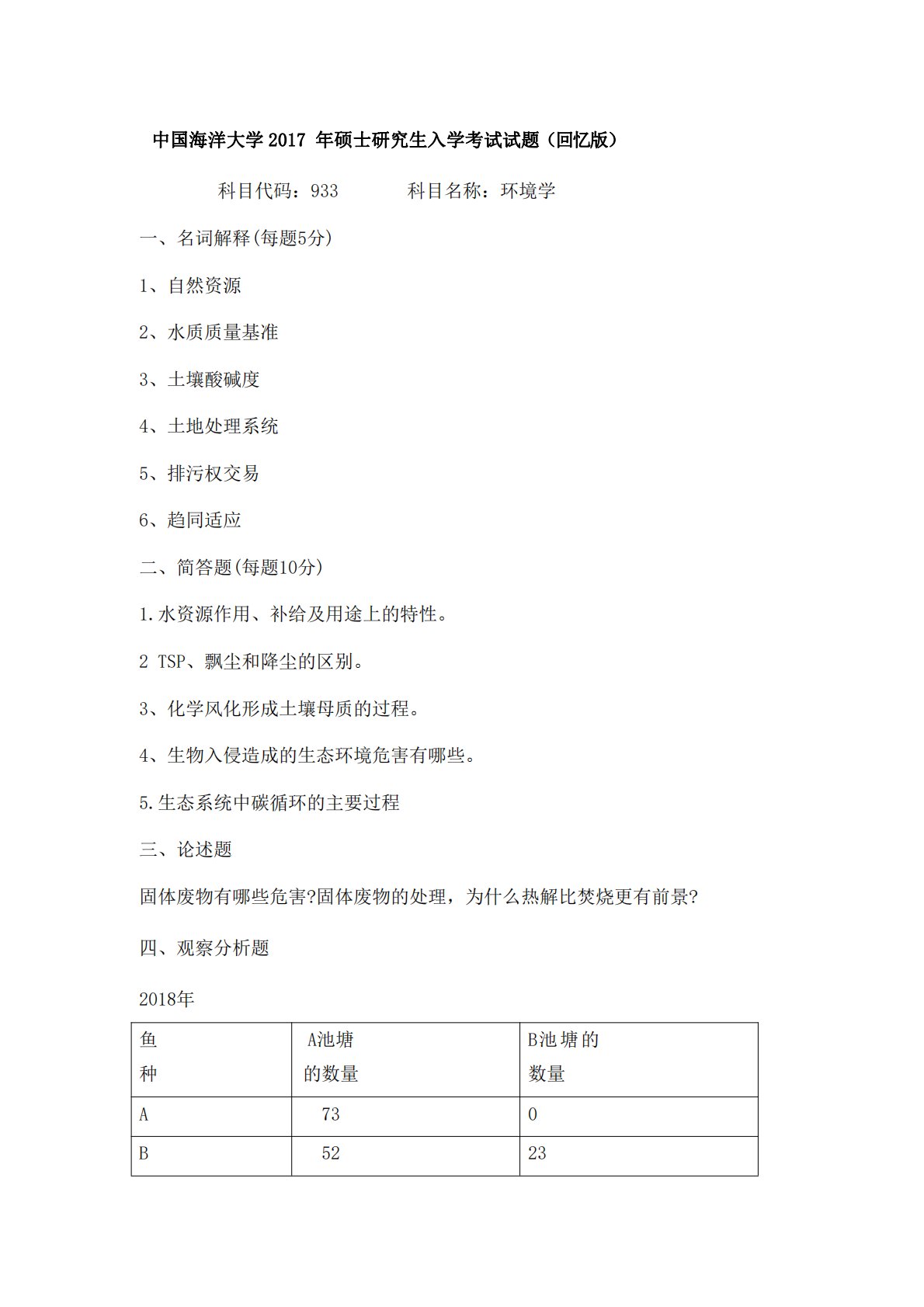 中国海洋大学2017年硕士研究生入学考试试题(回忆版)科目代码:933科目名称:环境学一、名词解释(每题5分)1、自然资源2、水质质量基准3、土壤酸碱度4、土地处理系统5、排污权交易6、趋同适应二、简答题(每题10分)1.水资源作用、补给及用途上的特性。2TSP、飘尘和降尘的区别。3、化学风化形成土壤母质的过程。4、生物入侵造成的生态环境危害有哪些。5.生态系统中碳循环的主要过程三、论述题固体废物有哪些危害?固体废物的处理,为什么热解比焚烧更有前景?四、观察分析题2018年鱼种A池塘的数量B池塘的数量A730B5223C3547D4557E7345F48532010年鱼种A池塘的数量B池塘的数...