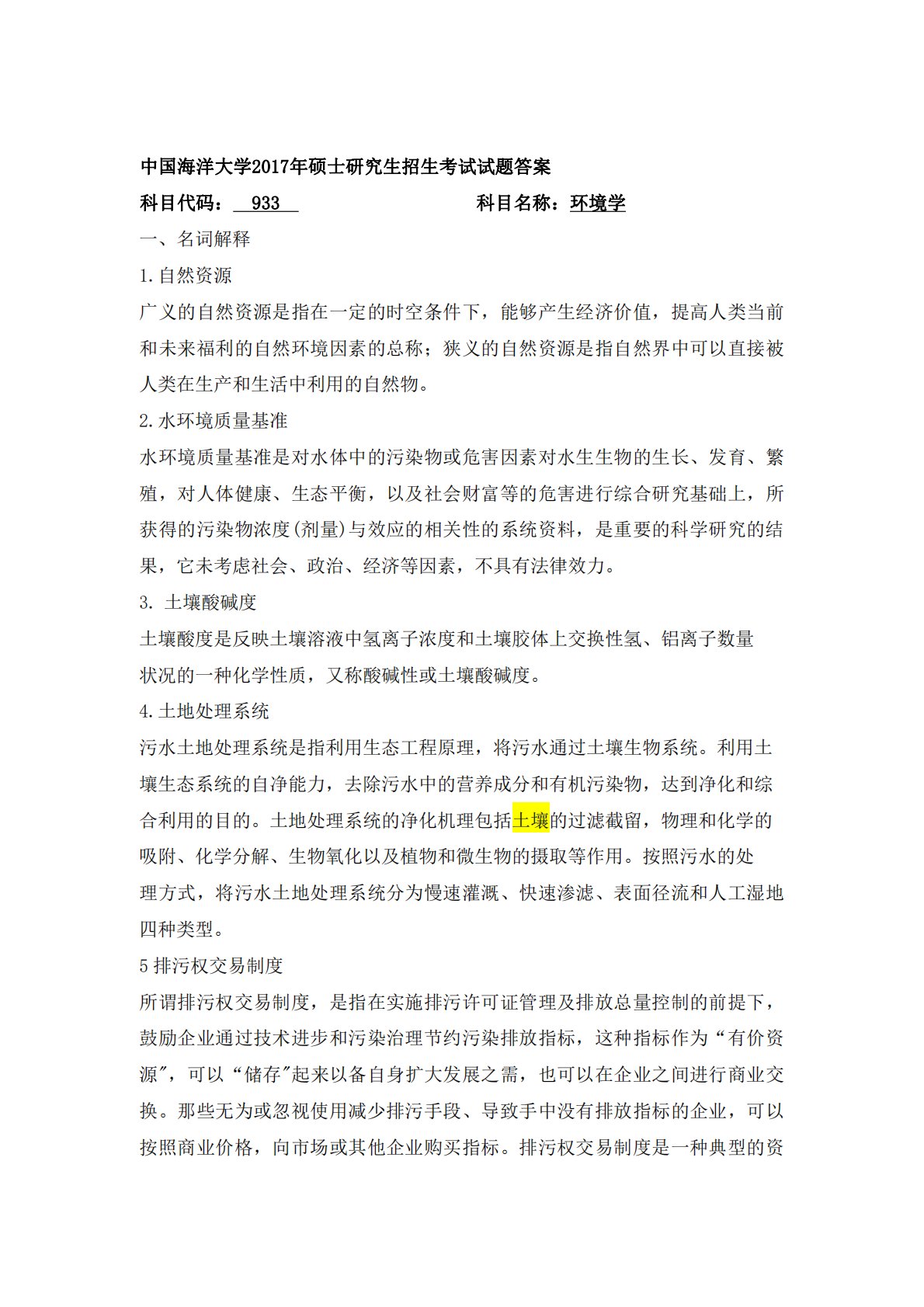 中国海洋大学2017年硕士研究生招生考试试题答案科目代码:933科目名称:环境学一、名词解释1.自然资源广义的自然资源是指在一定的时空条件下,能够产生经济价值,提高人类当前和未来福利的自然环境因素的总称;狭义的自然资源是指自然界中可以直接被人类在生产和生活中利用的自然物。2.水环境质量基准水环境质量基准是对水体中的污染物或危害因素对水生生物的生长、发育、繁殖,对人体健康、生态平衡,以及社会财富等的危害进行综合研究基础上,所获得的污染物浓度(剂量)与效应的相关性的系统资料,是重要的科学研究的结果,它未考虑社会、政治、经济等因素,不具有法律效力。3.土壤酸碱度土壤酸度是反映土壤溶液中氢离子浓度和土...